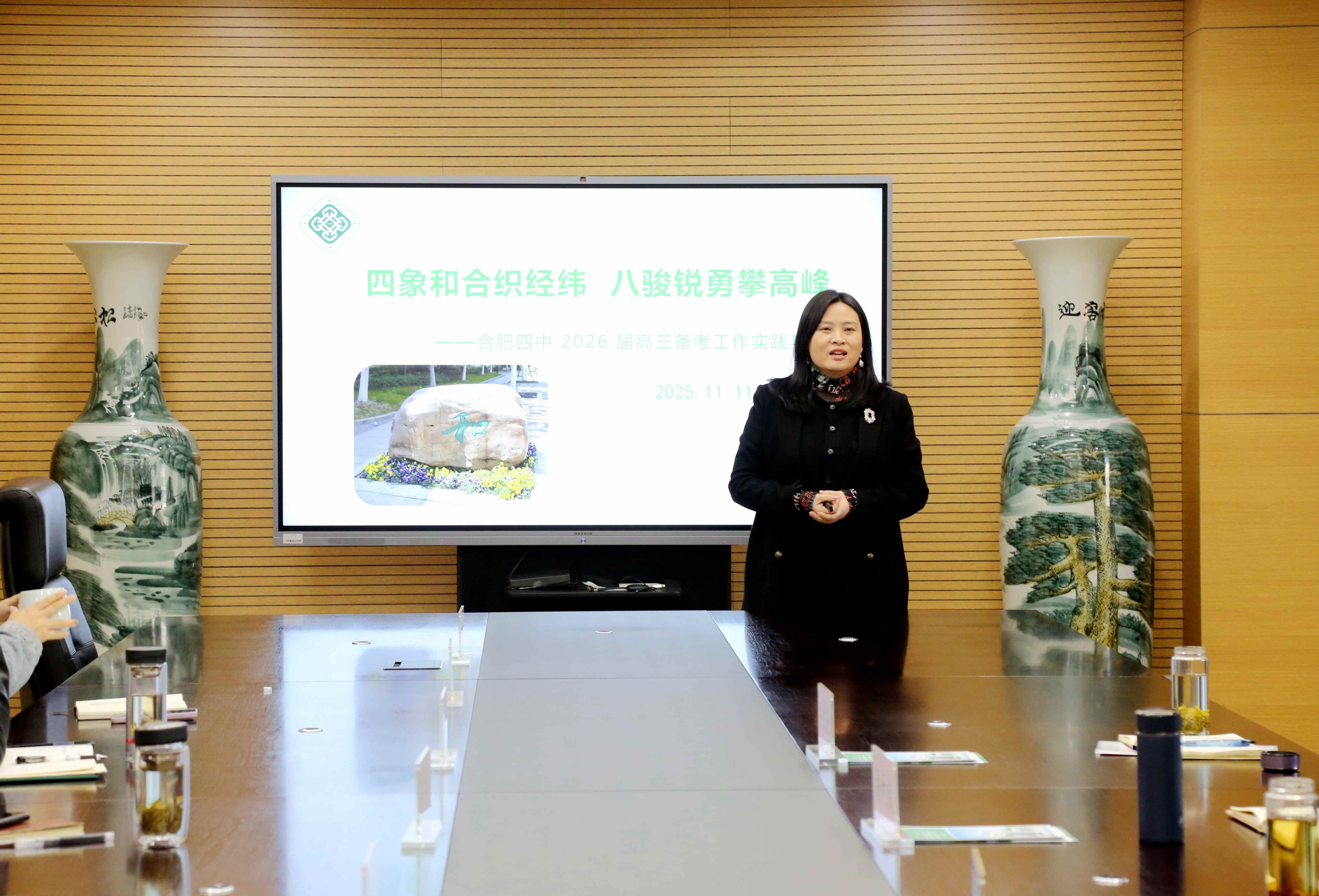 合肥四中高三年级部何飞主任作了题为《四象和合织经纬,八骏锐勇攀高峰》的分享。何飞从备考总纲、核心策略等角度展开,重点介绍了高三年级在目标领航、高效课堂、学情追踪、精准辅导、深耕教研、家校合作等方面的做法和经验。