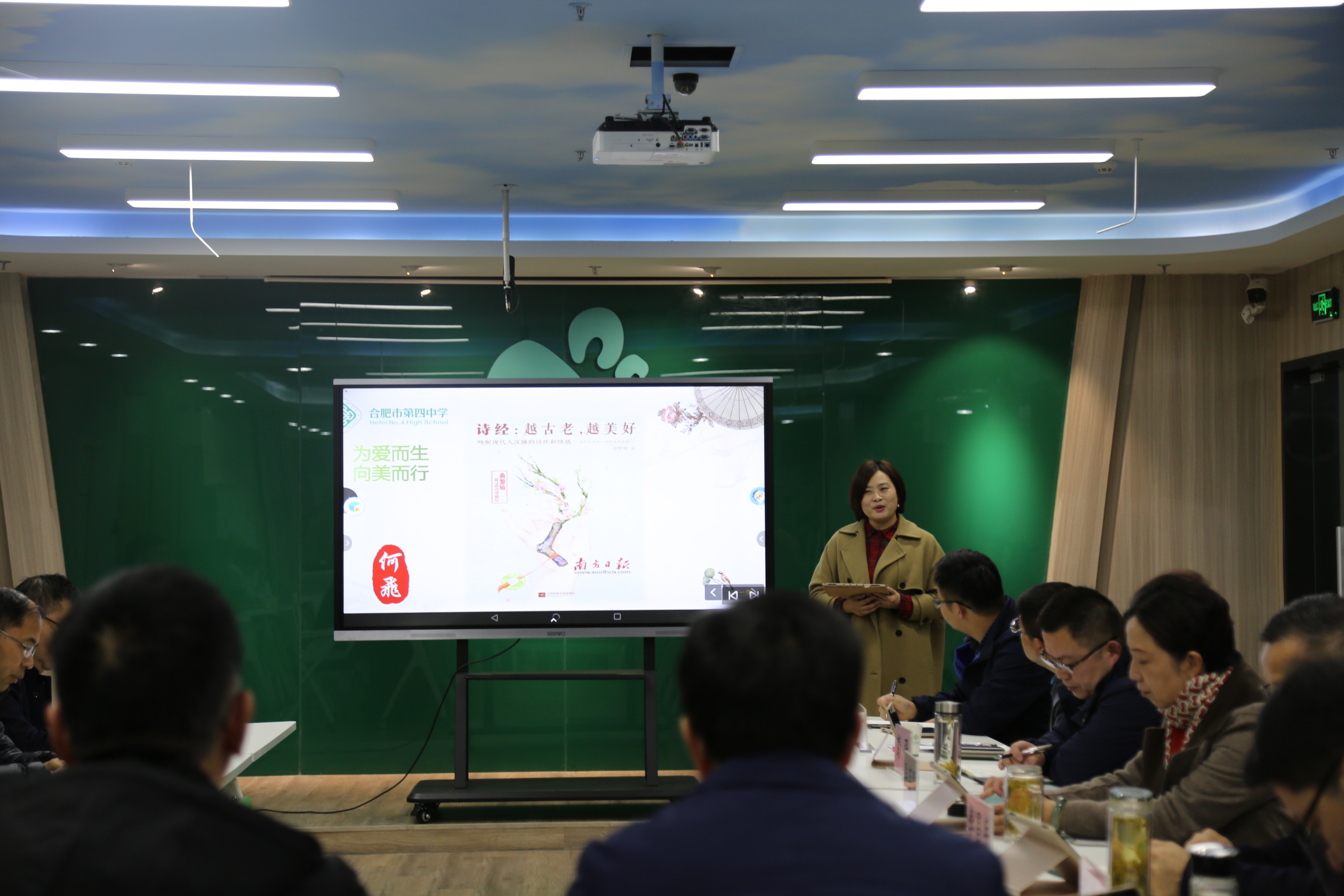 首先,合肥三中管理团队旁听了合肥四中本周的行政办公会。按照惯例,合肥四中每次行政办公会前均安排一名与会干部进行阅读分享。此次阅读分享为合肥四中高一年级部副主任何飞带来的曲黎敏的《诗经:越古老,越美好》。在阅读分享中,何飞从推荐理由、阅读感悟等角度展开,全面诠释了《诗经》中所蕴含的德育、美育以及劳育内容,令与会者深受启发。