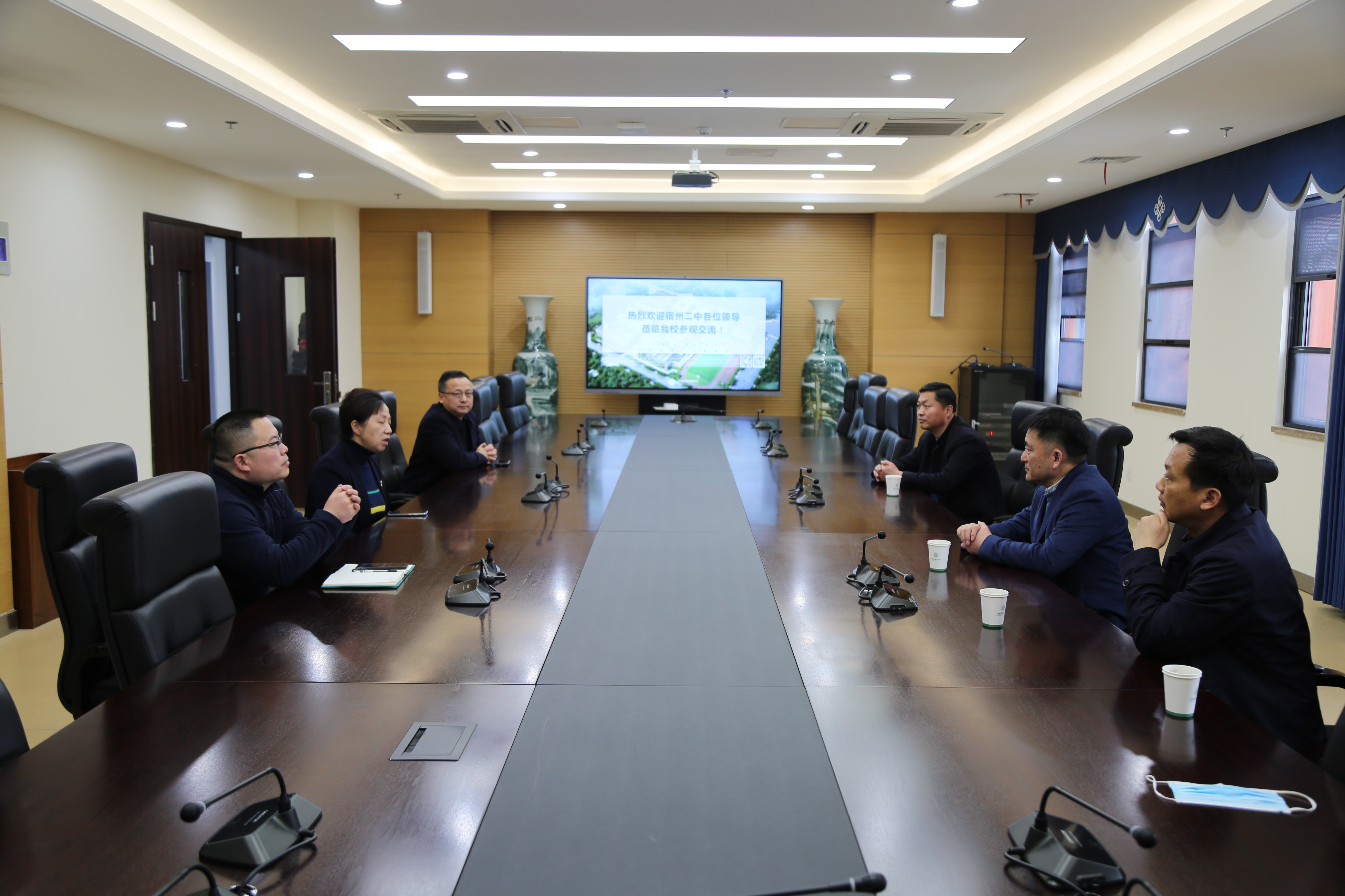 2021年3月23日下午,宿州二中校长曹振锋、副校长周刚一行莅临合肥四中参观交流。合肥四中校长吴英明,副校长李昌年、彭强、赵勇以及办公室副主任裴启超等参与接待。