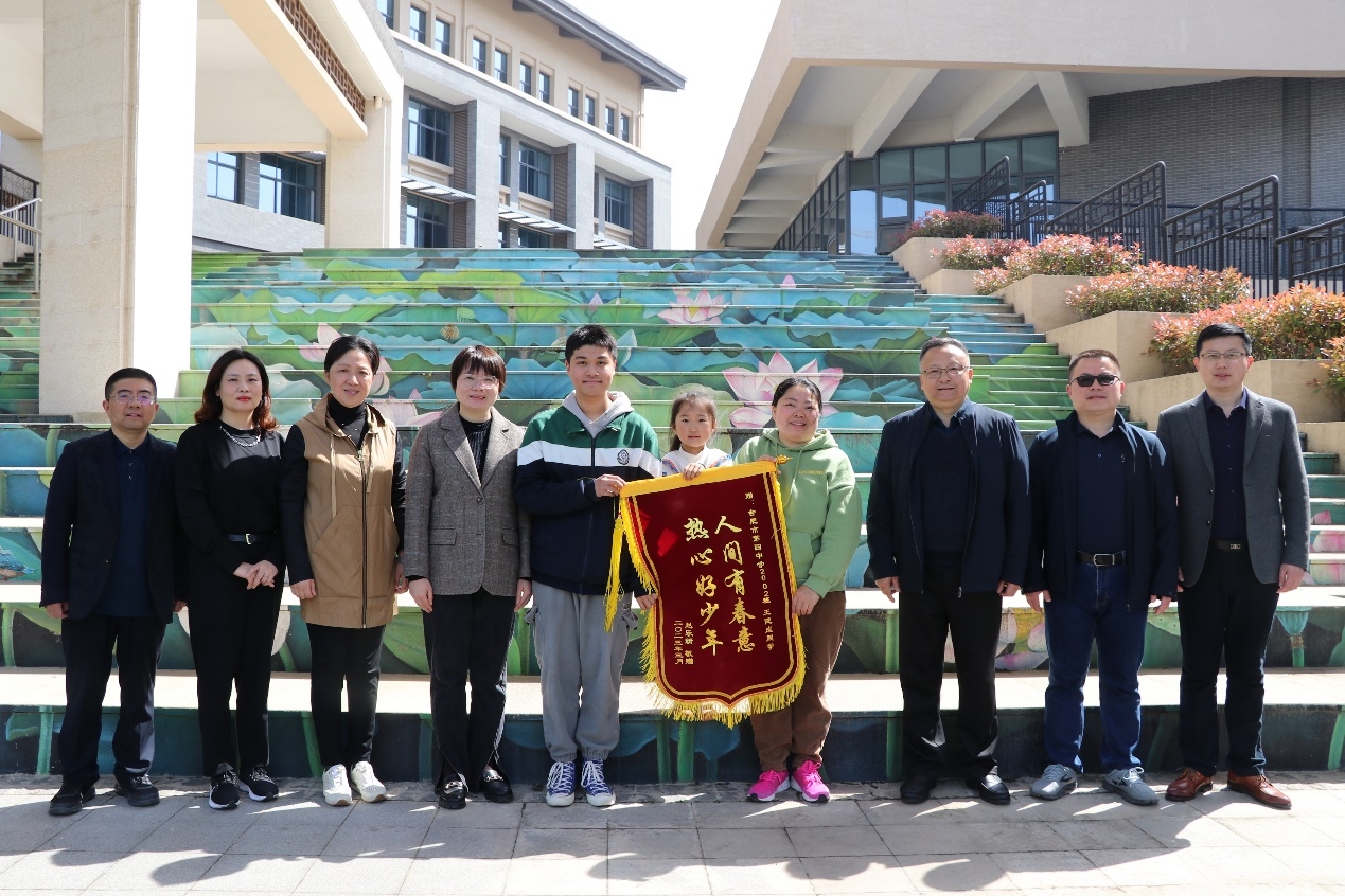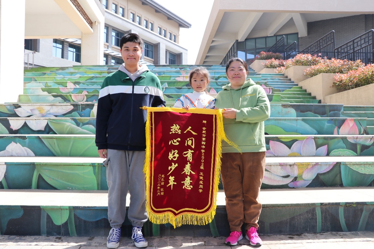 惠风和畅,春阳温暖。2023年4月10日上午,一面绣有“人间有春意,热心好少年”的锦旗被送到合肥市第四中学,“谢谢合肥四中的老师和哥哥姐姐们”的爽朗童声响彻四中校园。锦旗赠送者和她的女儿以这种质朴真诚的方式,对合肥四中2002班王健成同学助人为乐的先进事迹表示衷心的感谢。