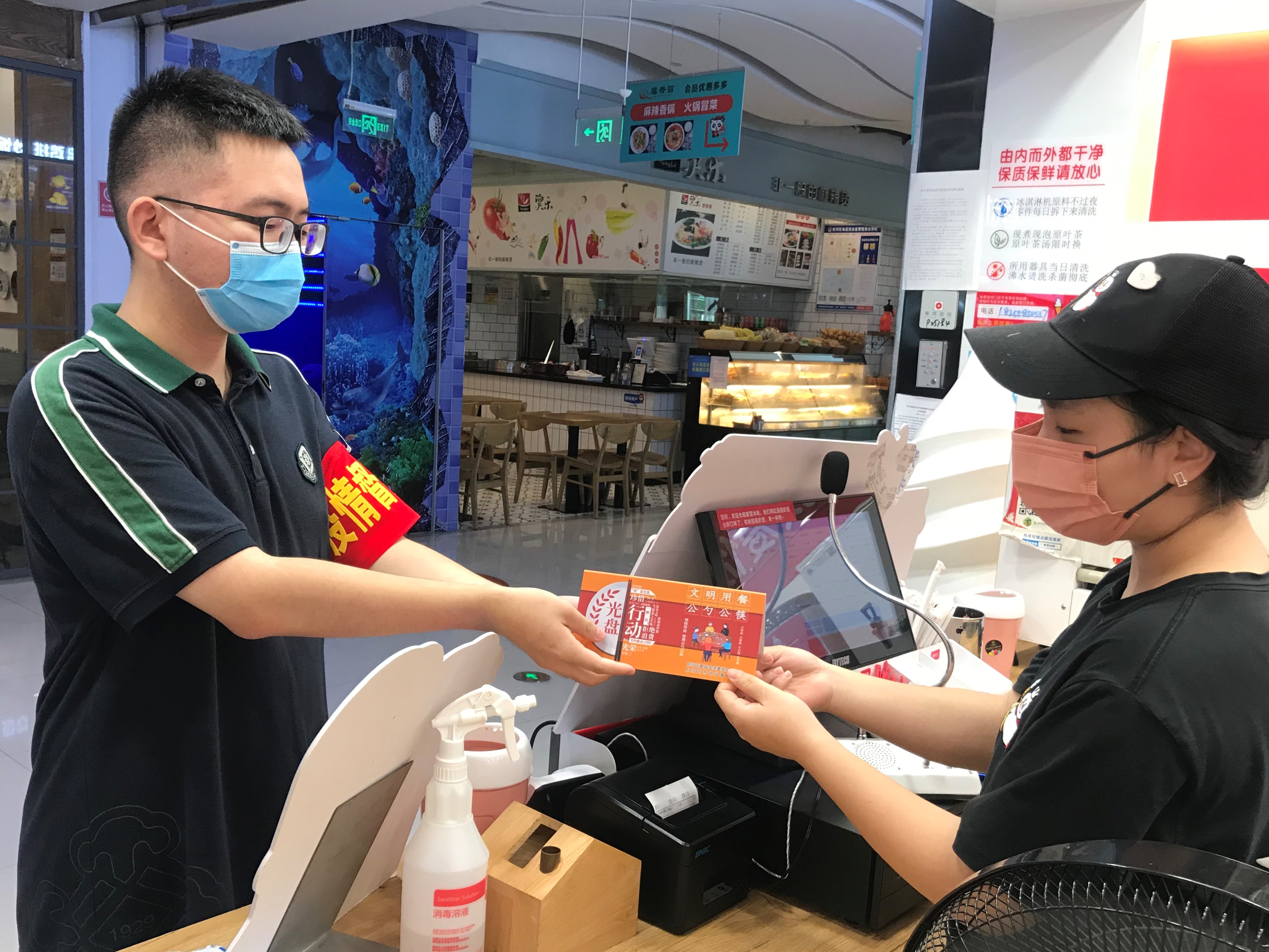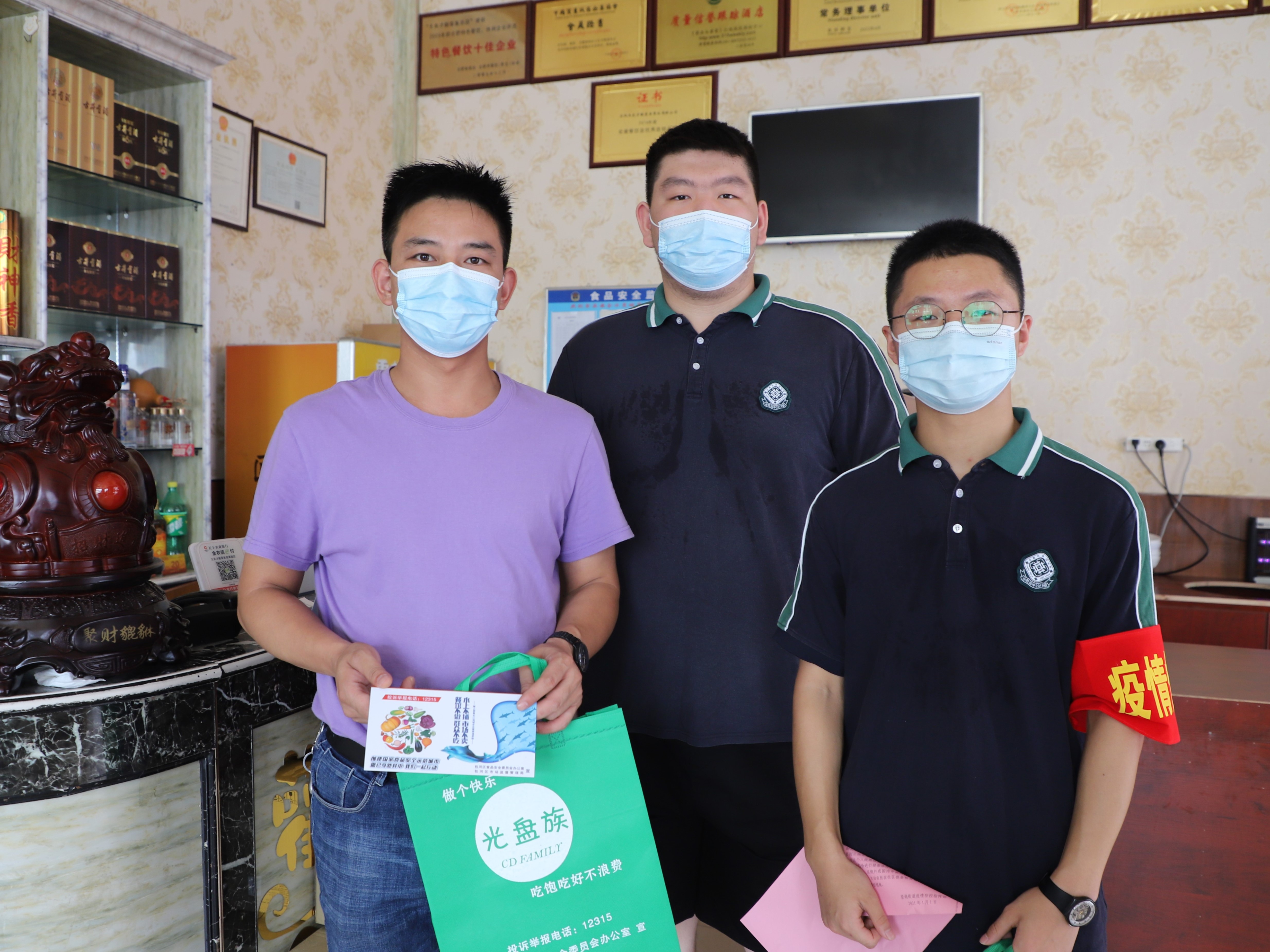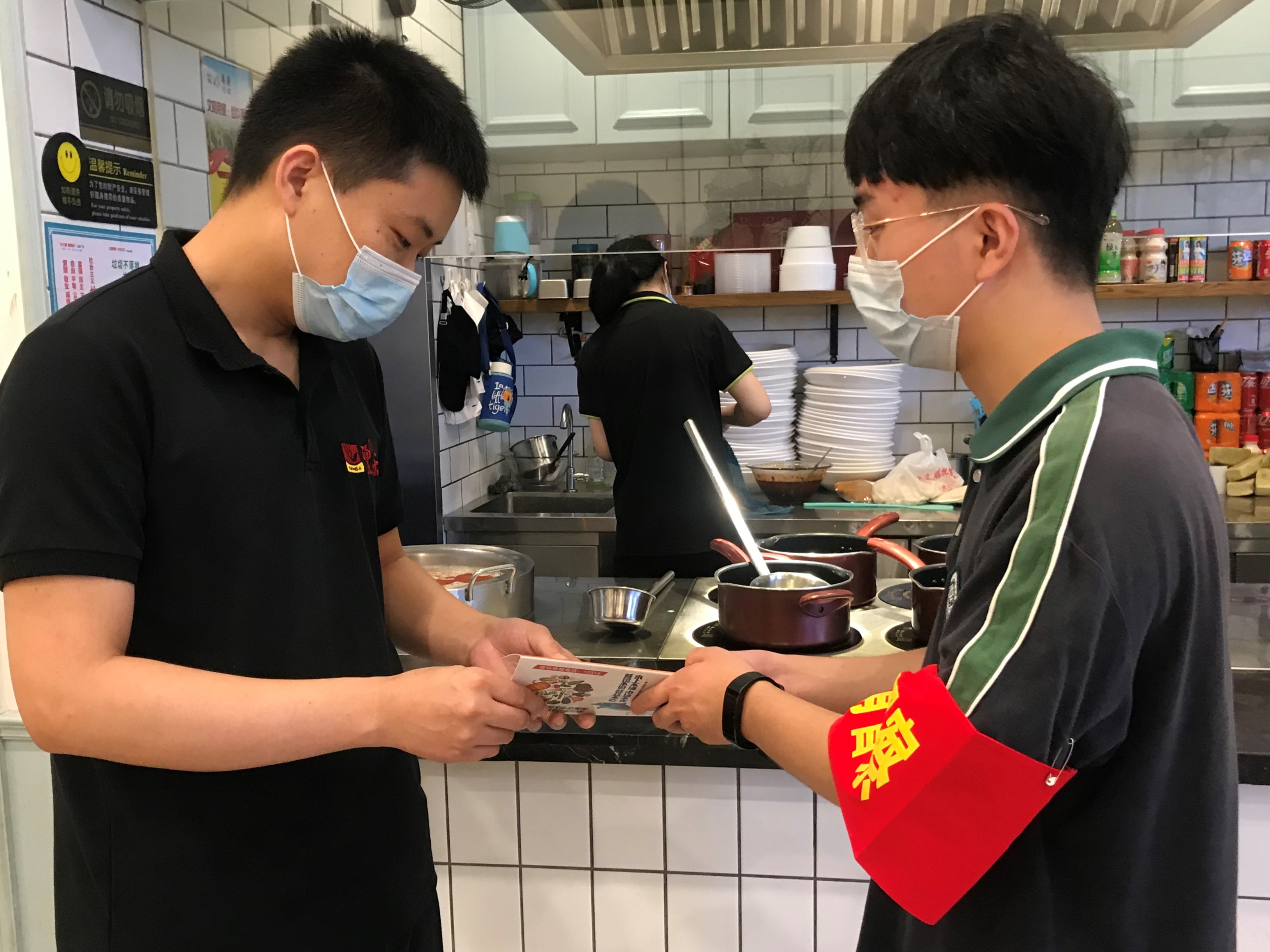 在王卫社区的志愿服务活动中,同学们一方面前往附近的加侨广场,对其中的餐饮商家进行光盘行动的相关宣传,并赠送光盘行动立牌;另一方面则深入周边居民区,向社区居民开展疫情防控相关宣传,并协助社区工作人员张贴疫情防控海报等。