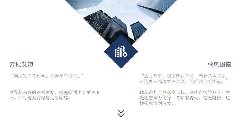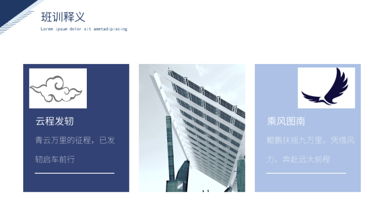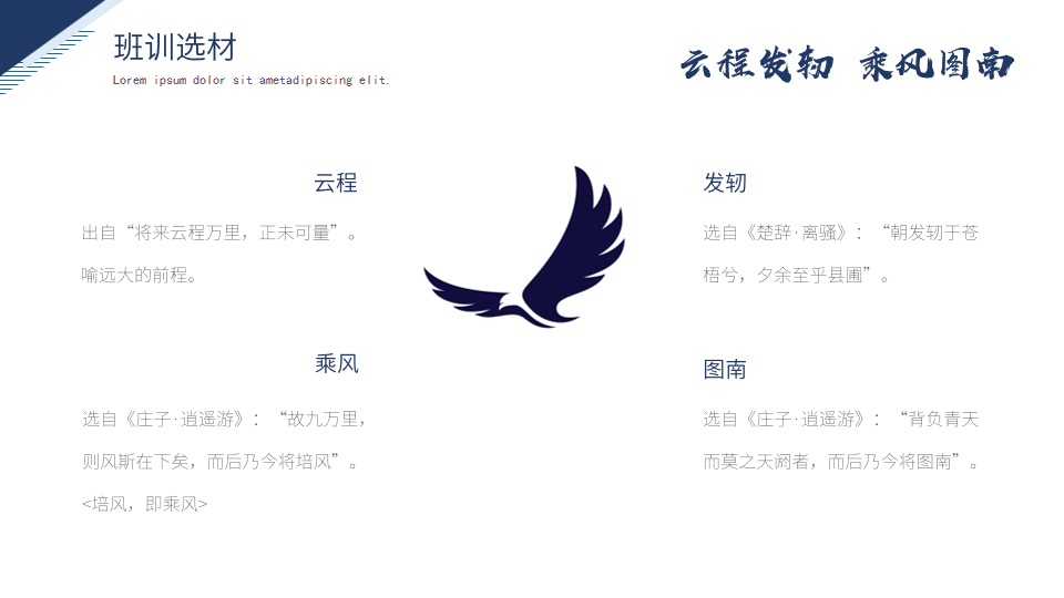班训释义:青云万里的征程,已发轫启车前行;鲲鹏扶摇九万里,凭借风力,奔赴远大前程。前句选自《楚辞·离骚》:“朝发轫于苍梧兮,夕余至乎县圃”。后句选自《庄子·逍遥游》:“故九万里,则风斯在下矣,而后乃今将培风。背负青天而莫之天阏者,而后乃今将图南。”
