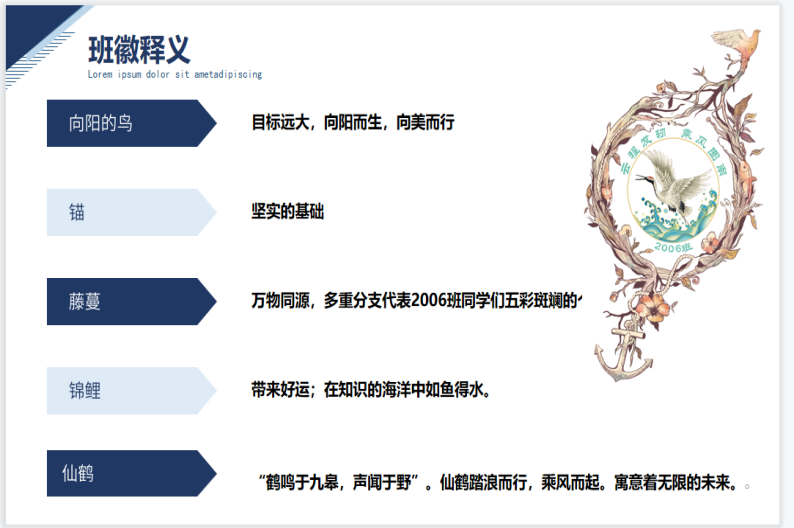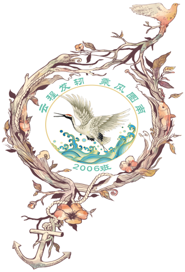 班徽由外框藤蔓、主体仙鹤和沧海及向阳的鸟、坚固的锚构成,精致美观,细节匠心独运。从方案设计到定稿绘图,从制作到完善,班徽设计小组精益求精、多次沟通协商,付出诸多努力,最终完成了班徽设计。