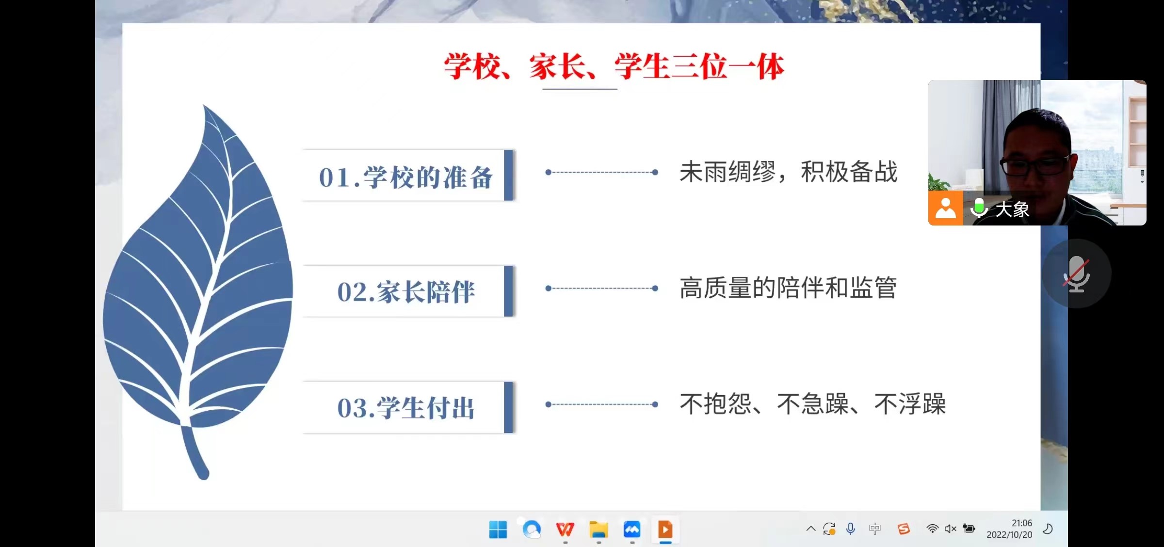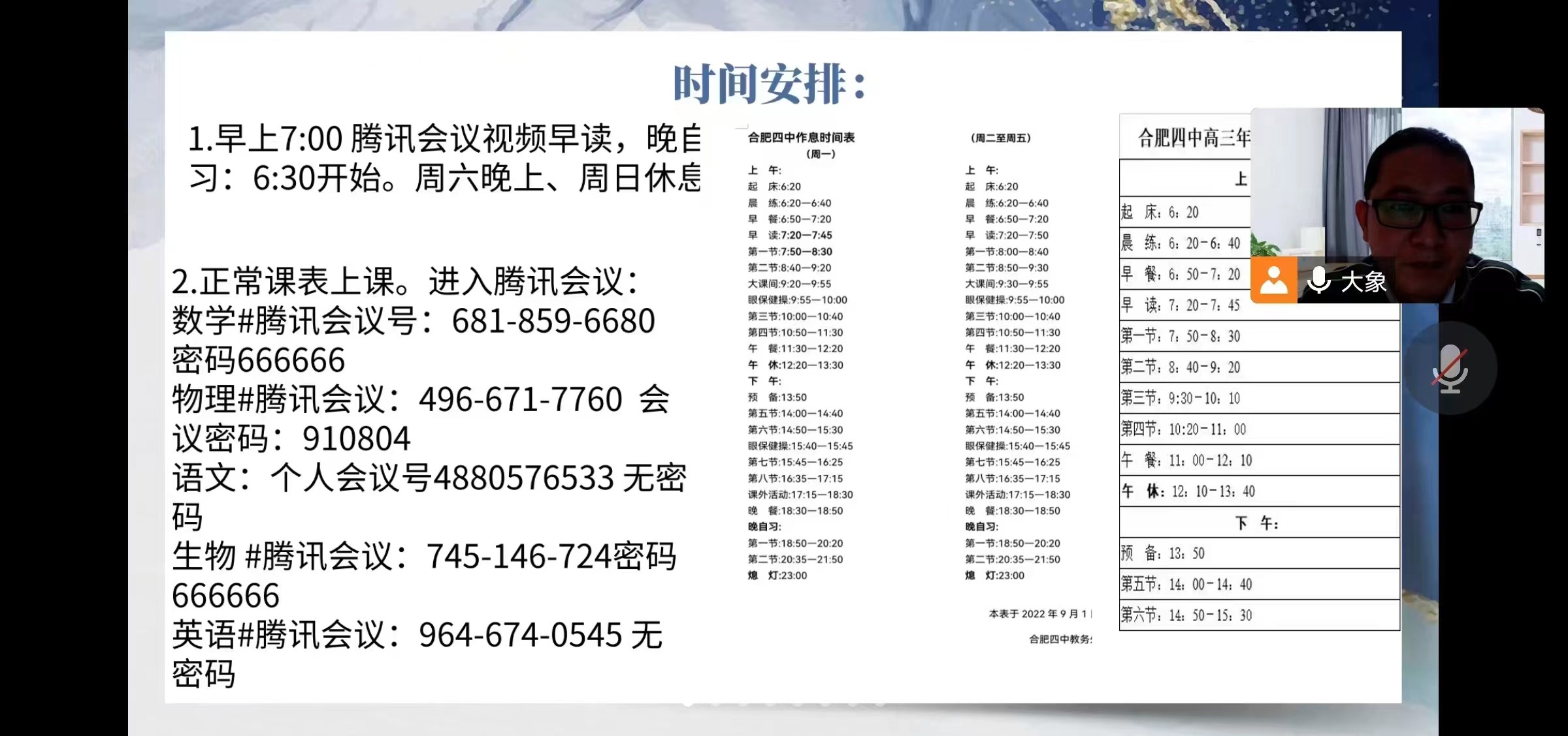 2022年10月20日晚上九点,合肥四中2006班班主任项老师召开了本学期第二次线上家长会。家长会分四个部分,项老师首先就大家最关心的线上教学问题做了详细的说明,学校未雨绸缪、积极备战,学校、家长、学生三位一体携手并进、共克时艰!