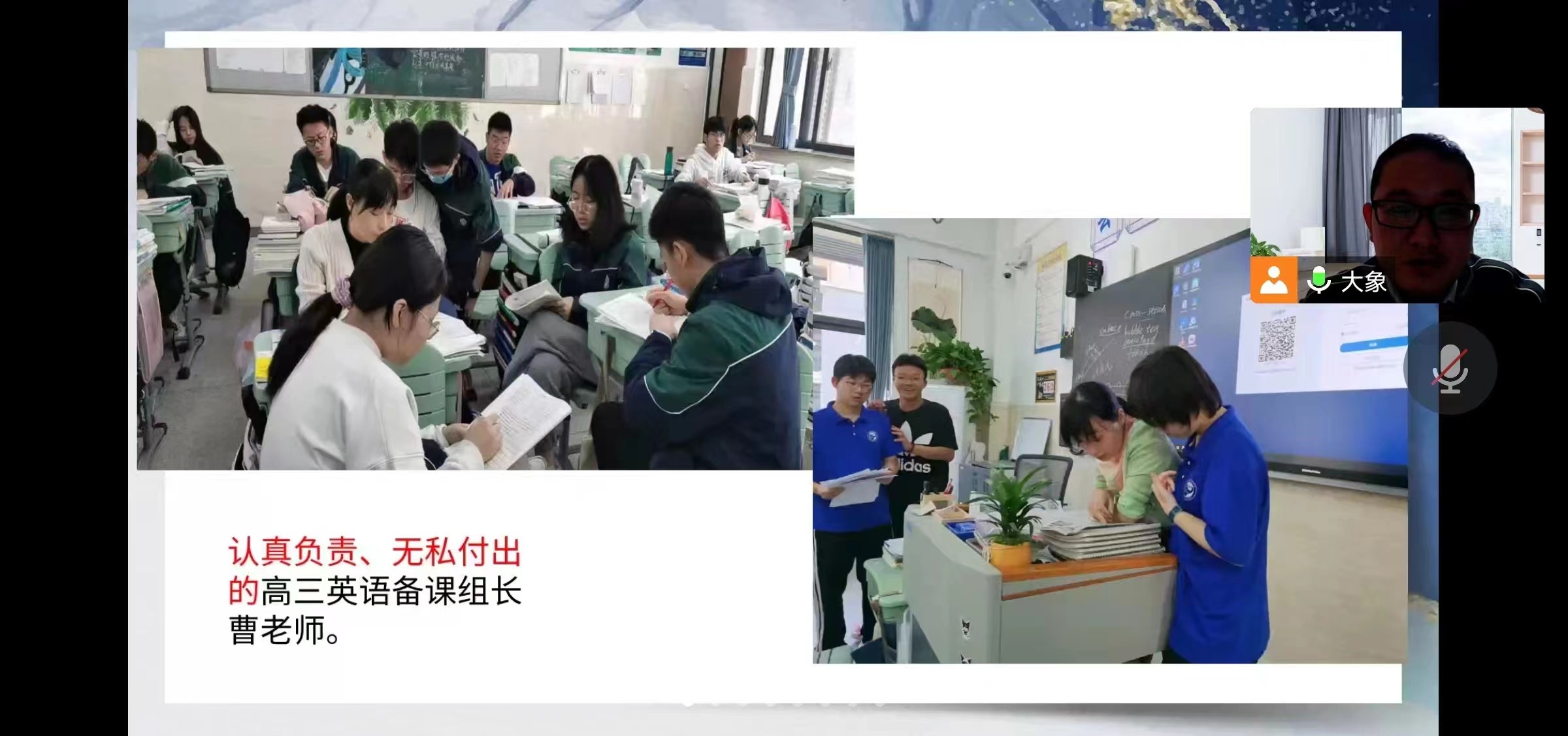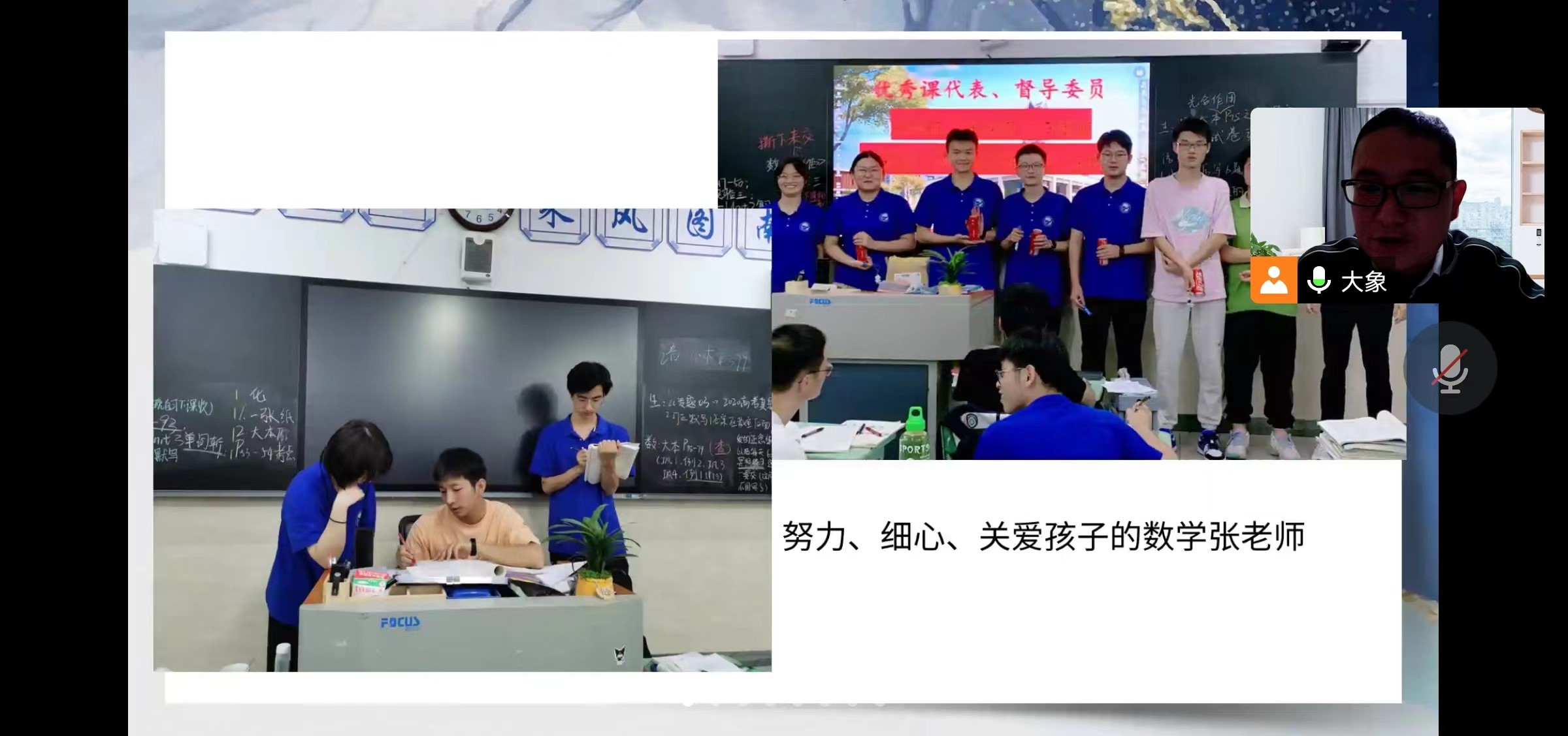 接着介绍了六班的教师团队,作为高三英语备课组组长的曹老师,认真负责,无私付出,即便是课间也经常在教室看到她为同学们答疑解惑;语文老师李老师刚带完上一届的毕业班,有着丰富的教学经验;数、理、化三位老师年轻、幽默、风趣,专业素养扎实,课堂氛围好,项老师作为班主任又是生物老师既要管理班级事务,又要抓教学,能力让家长们交口称赞!