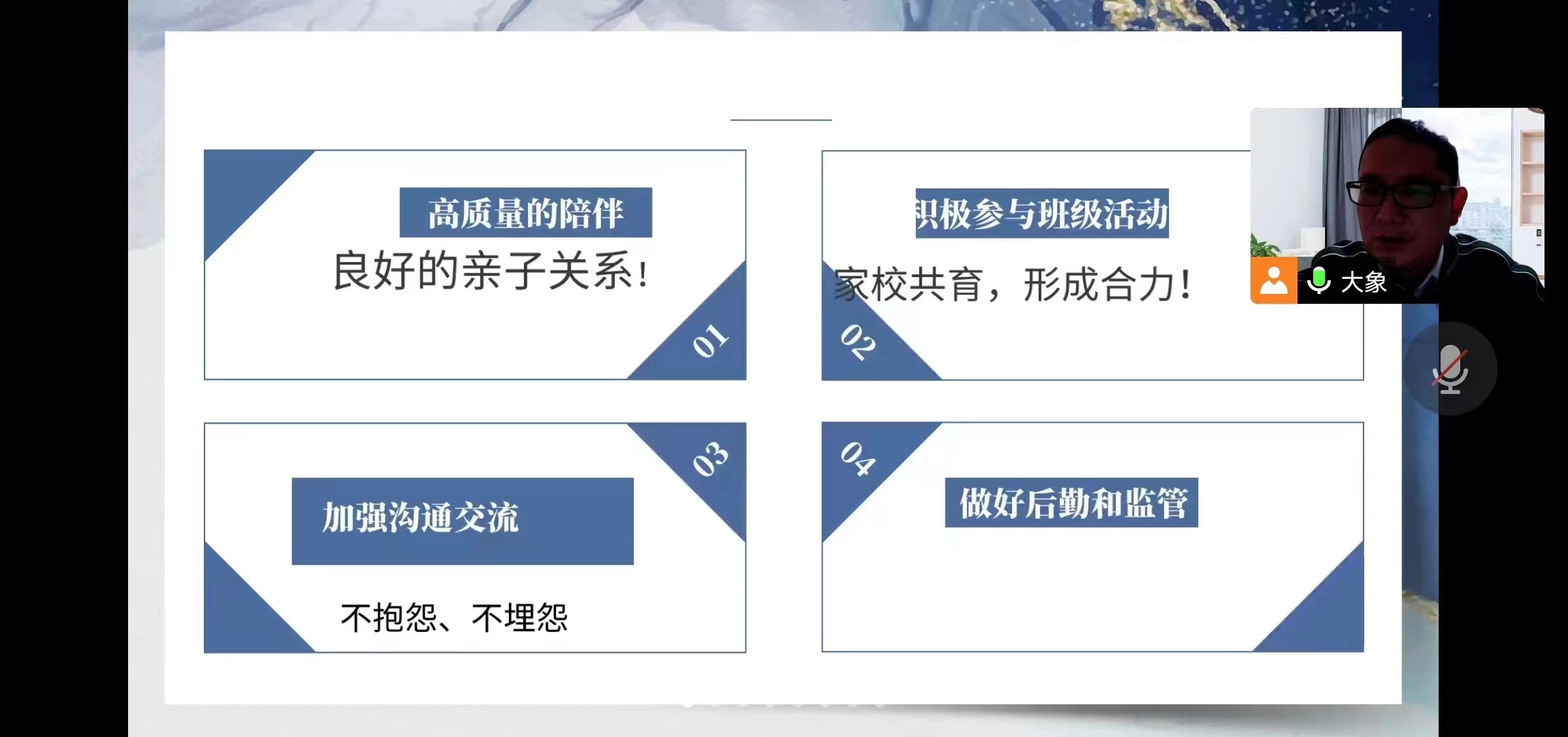 项老师之后又介绍了班级整体情况,开学以来的变化,家长们看到了自家孩子在学校的成长感到很欣慰。家长会的最后,老师嘱托我们在家学习不能抱怨,不急躁、不浮躁,有什么问题随时和老师沟通,就像在学校一样;嘱咐家长们做到高质量的陪伴和监督,老师和家长共同为我们的学习保驾护航!
