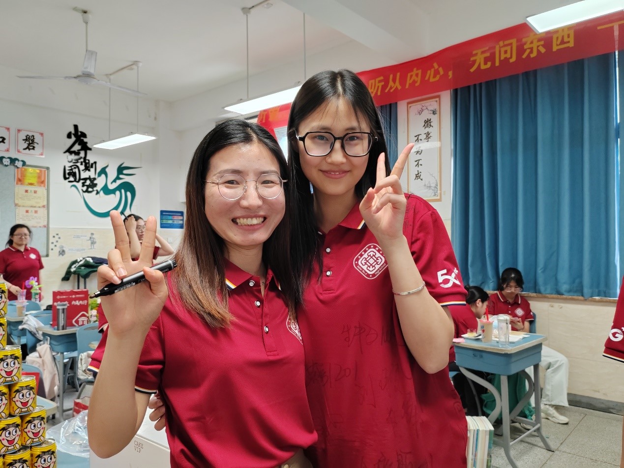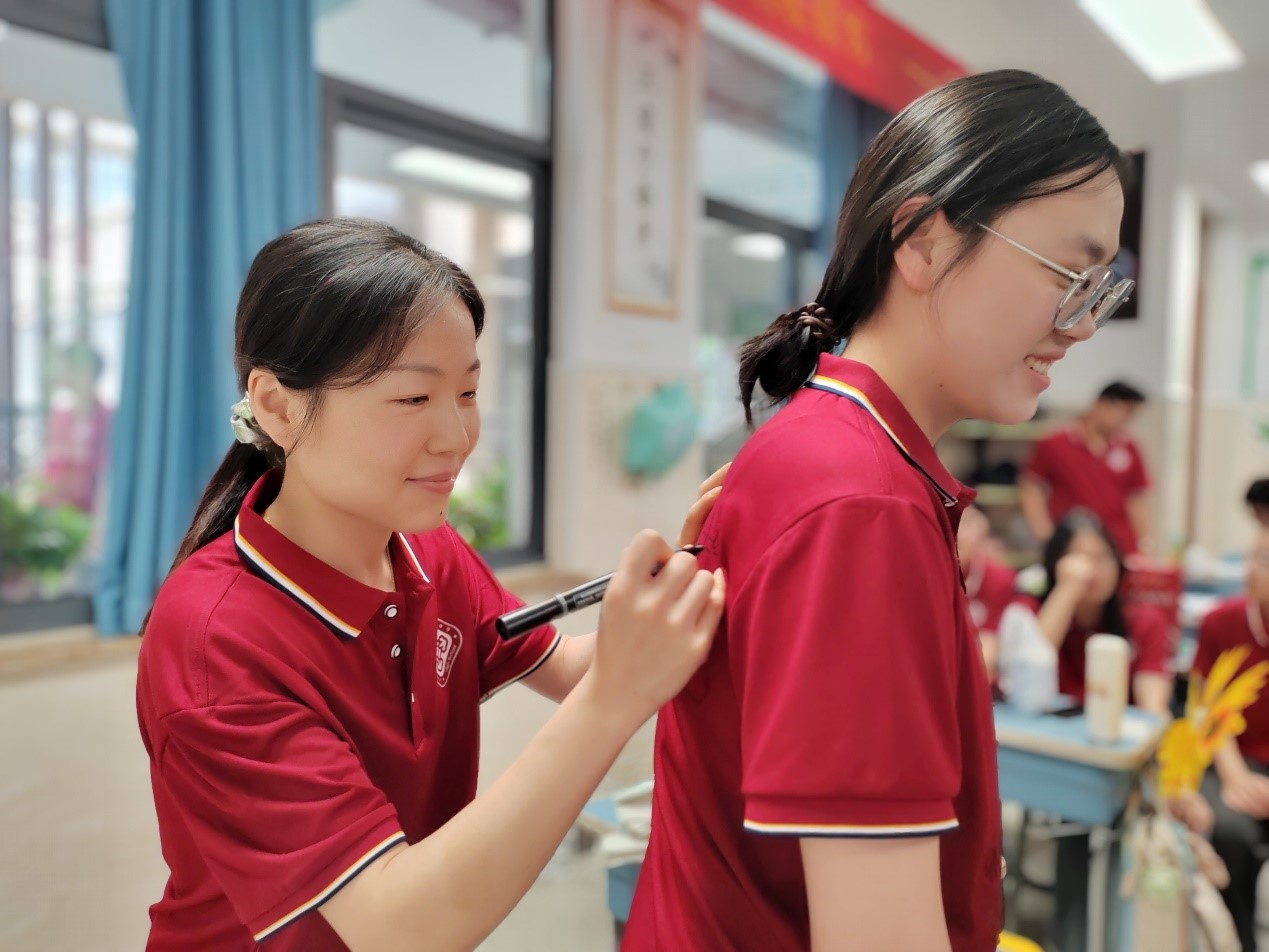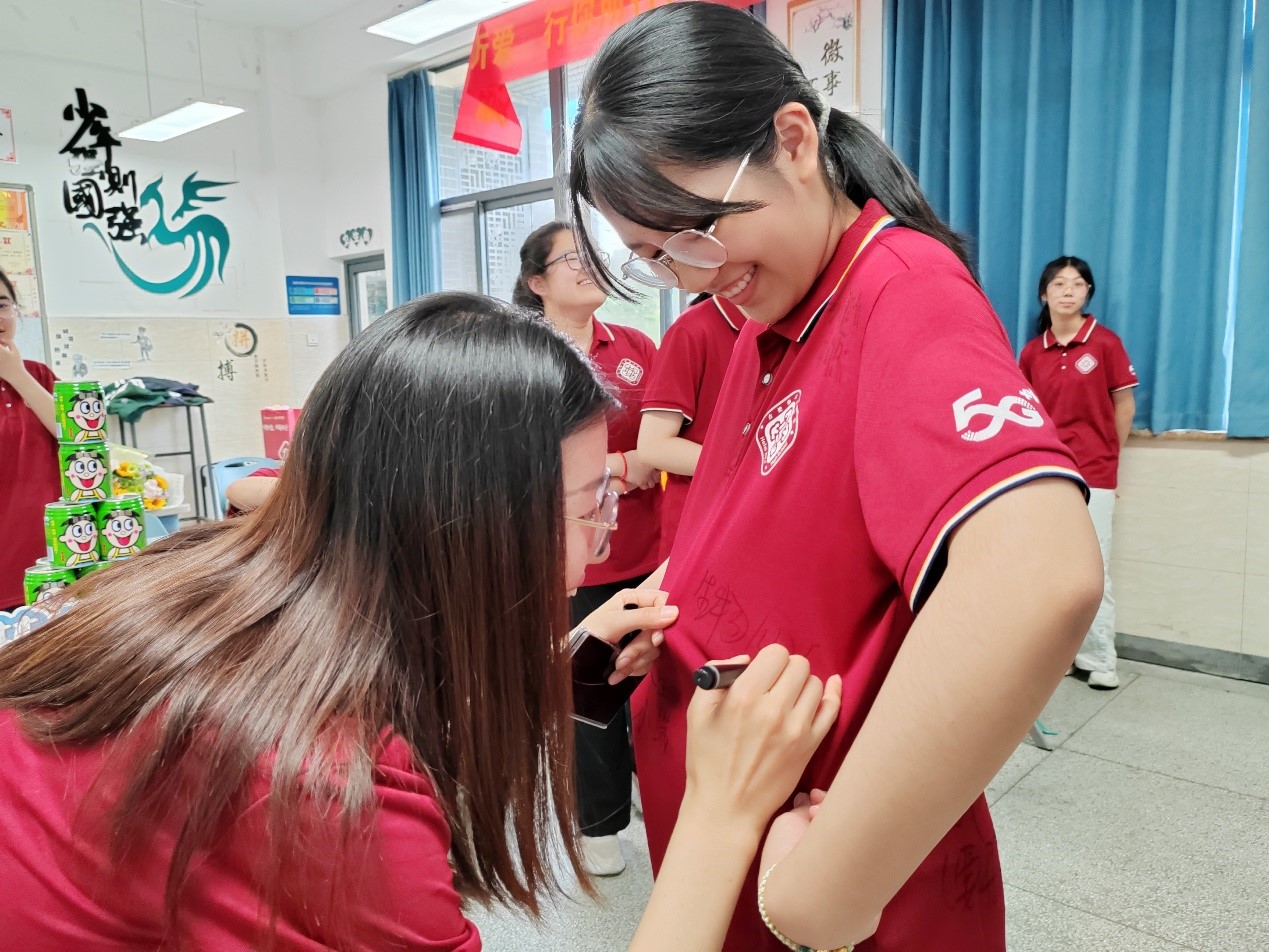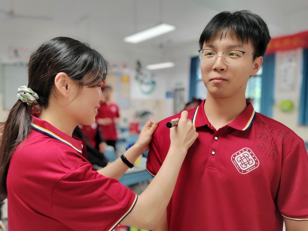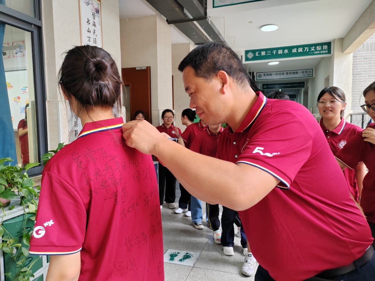 随后,学科老师们纷纷走上前来,在同学们的文化衫上写下祝福的话语。有的老师写下了“前程似锦”,有的老师写下了“金榜题名”,还有的老师写下了“梦想成真”。这些祝福的话语,不仅是老师们对同学们的期望与鼓励,更是他们陪伴同学们走过这段青春岁月的见证。