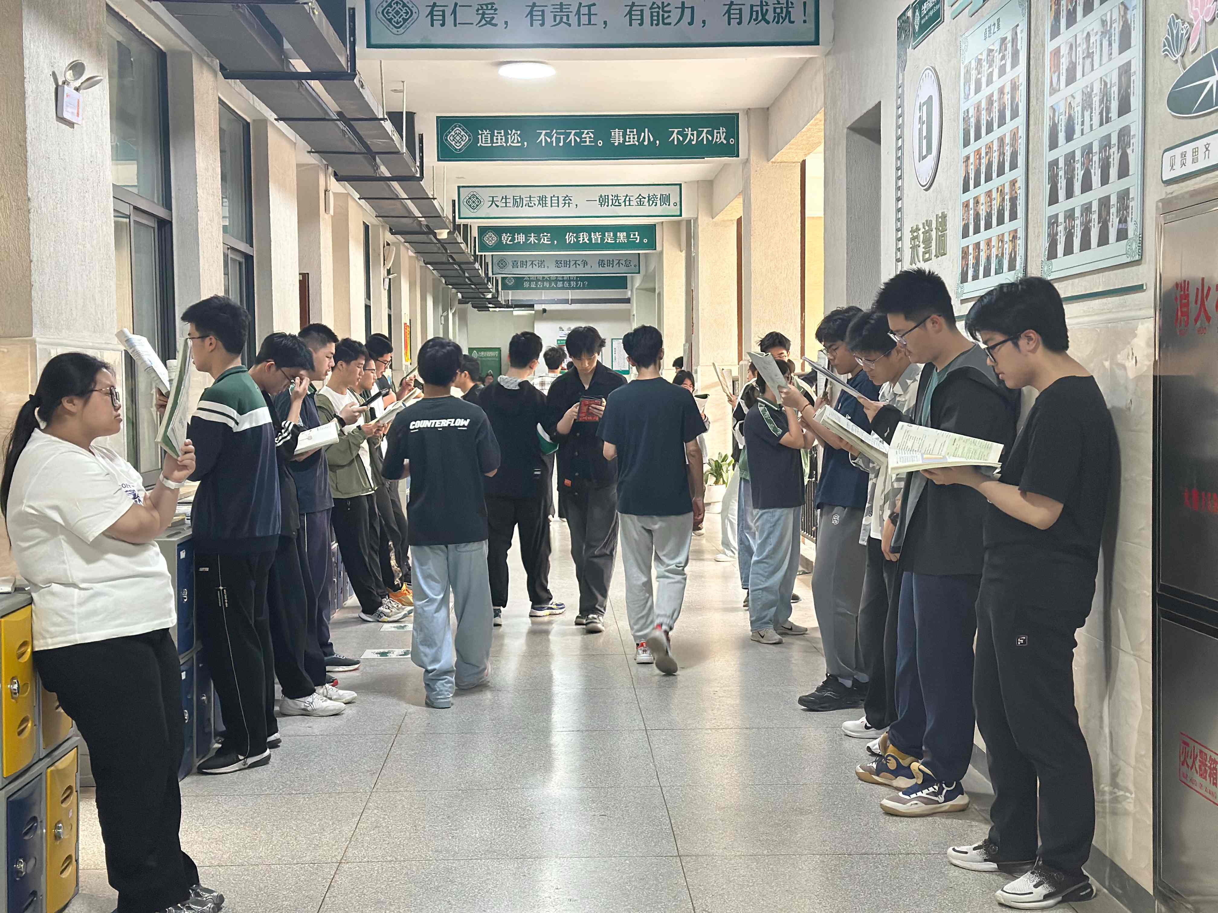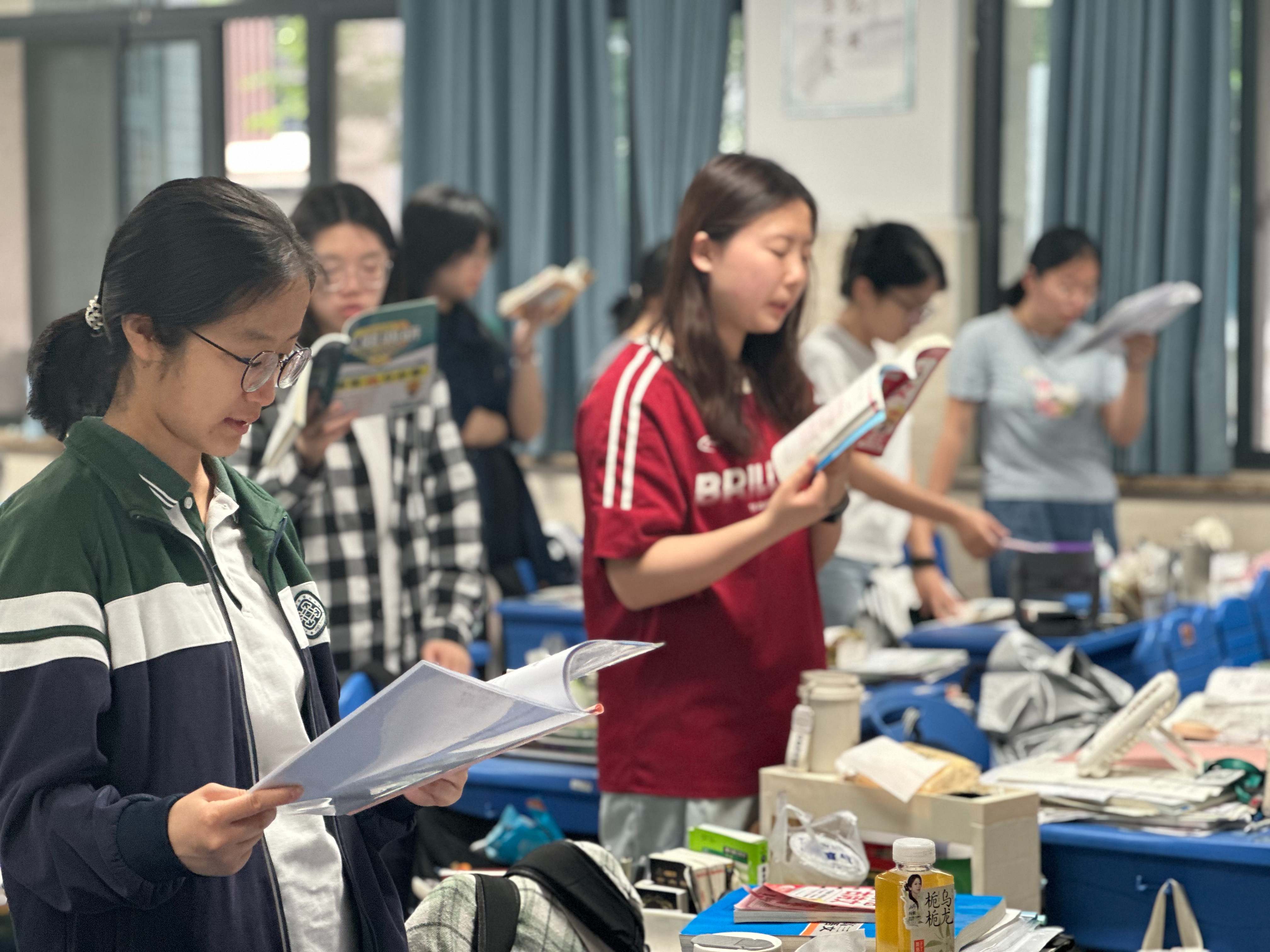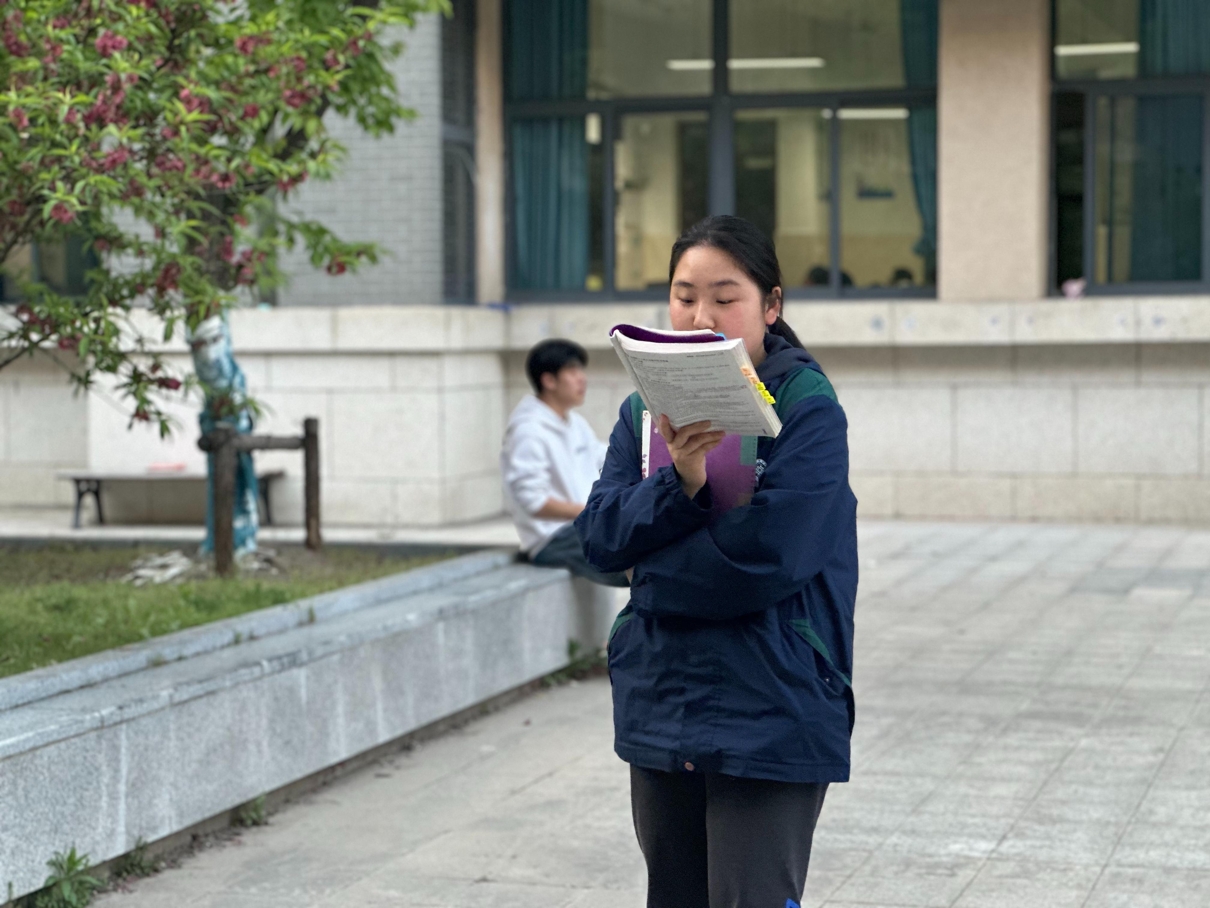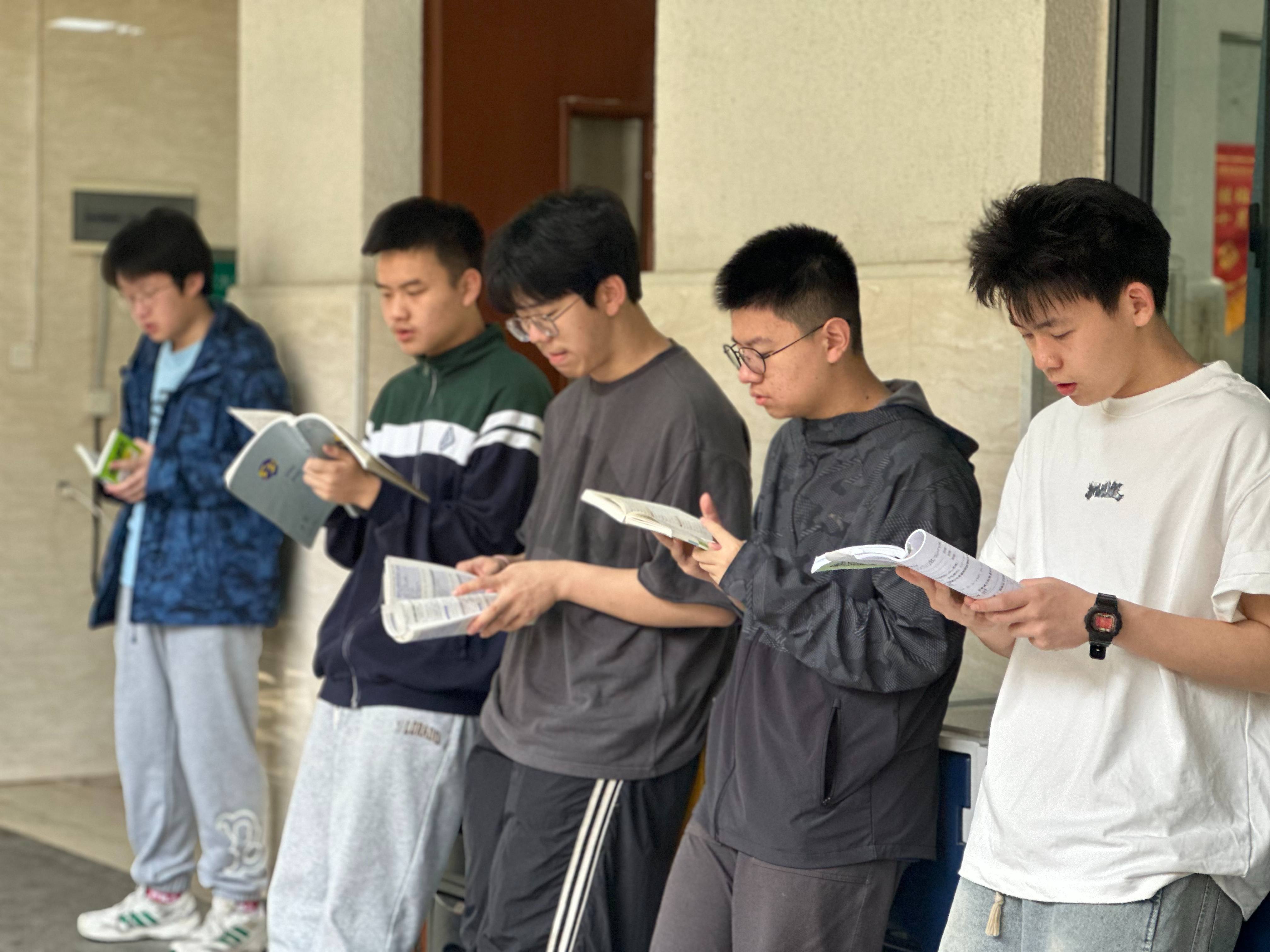 清晨六七点,高三教学楼的院子里、走廊上已站满了晨读的学生。他们或倚窗而立,或来回踱步,手捧书本,专注诵读。英语单词、文言文默写、政治原理……朗朗书声在晨光中回荡,成为校园里最动人的旋律。