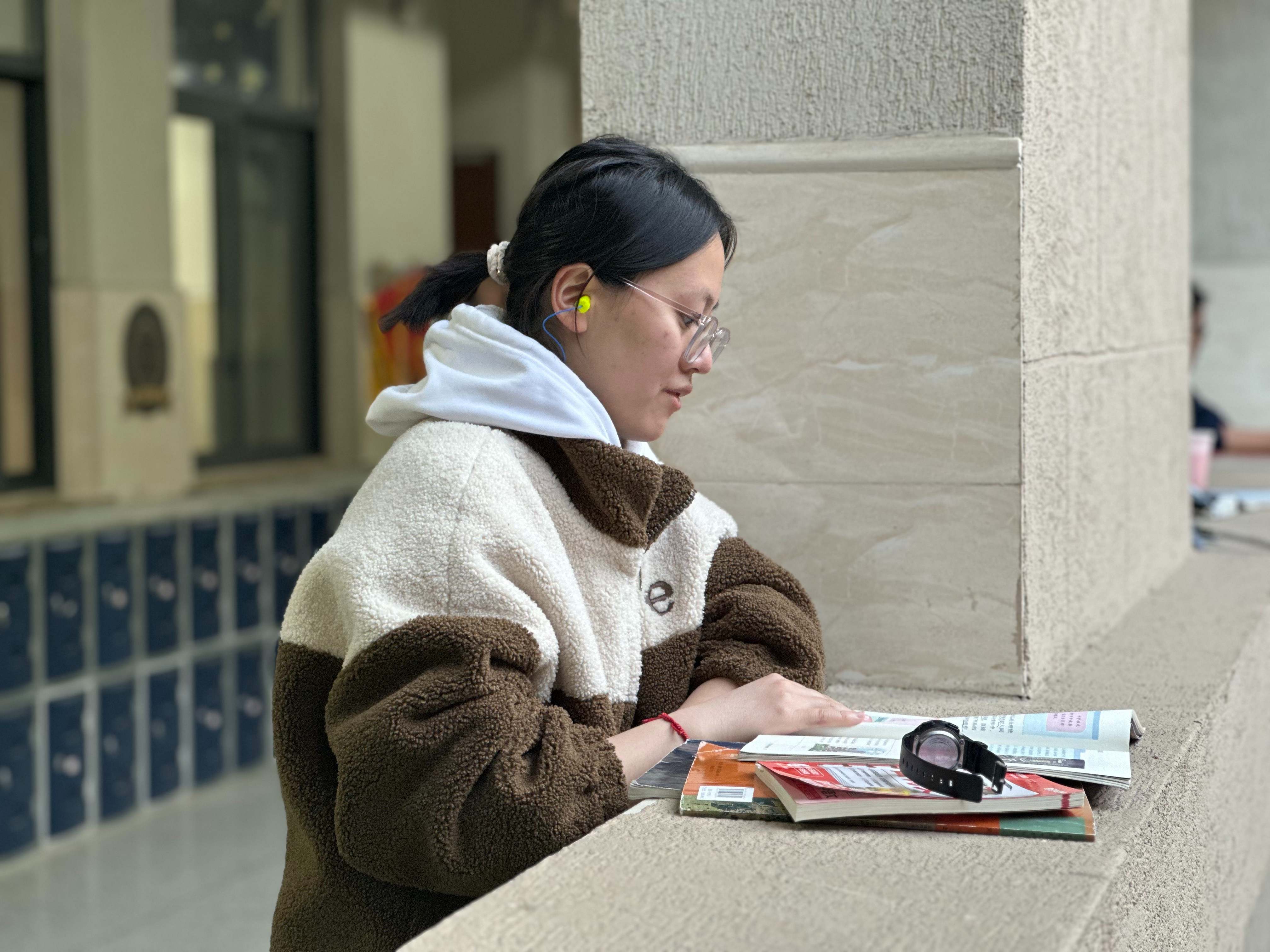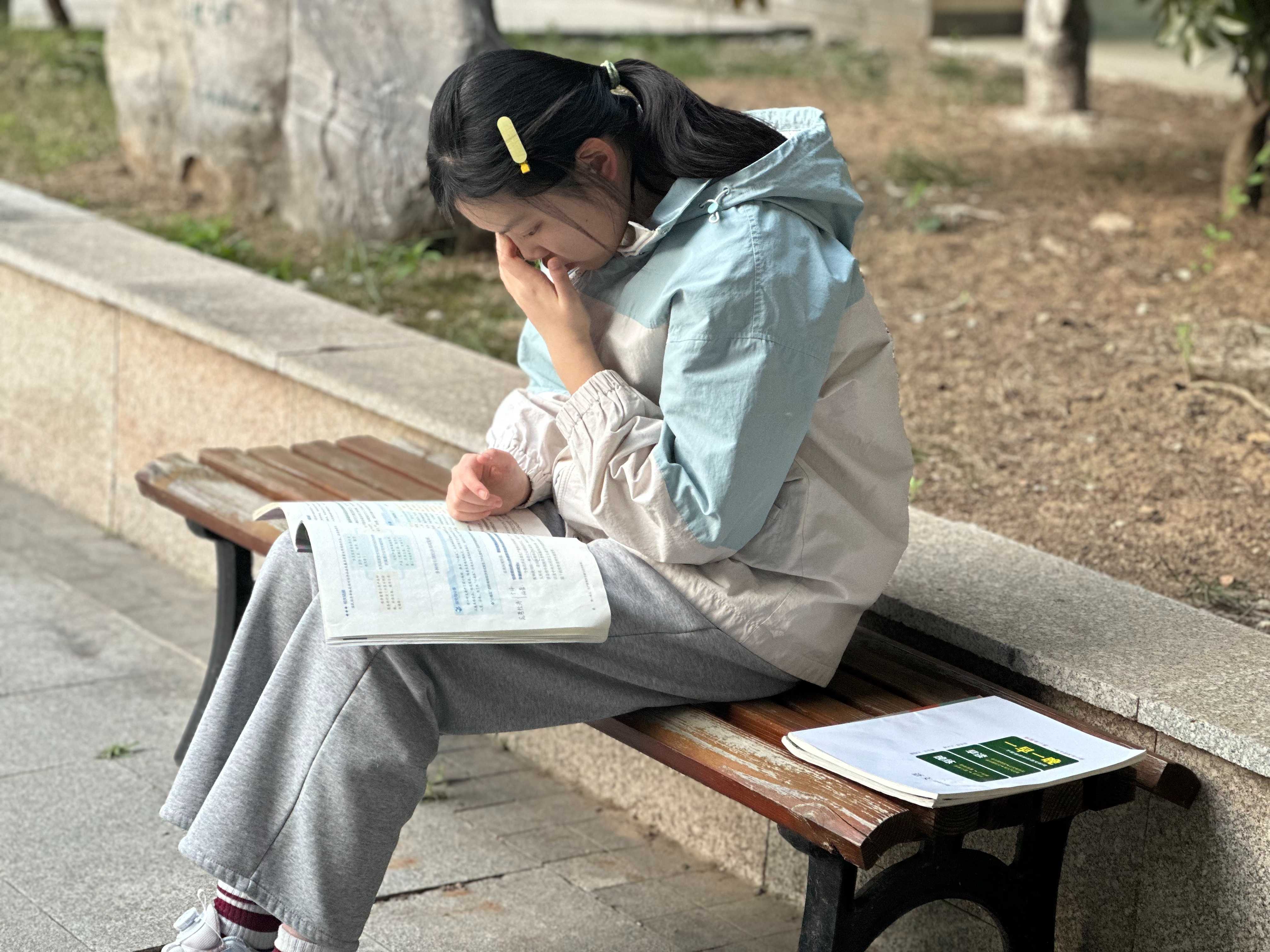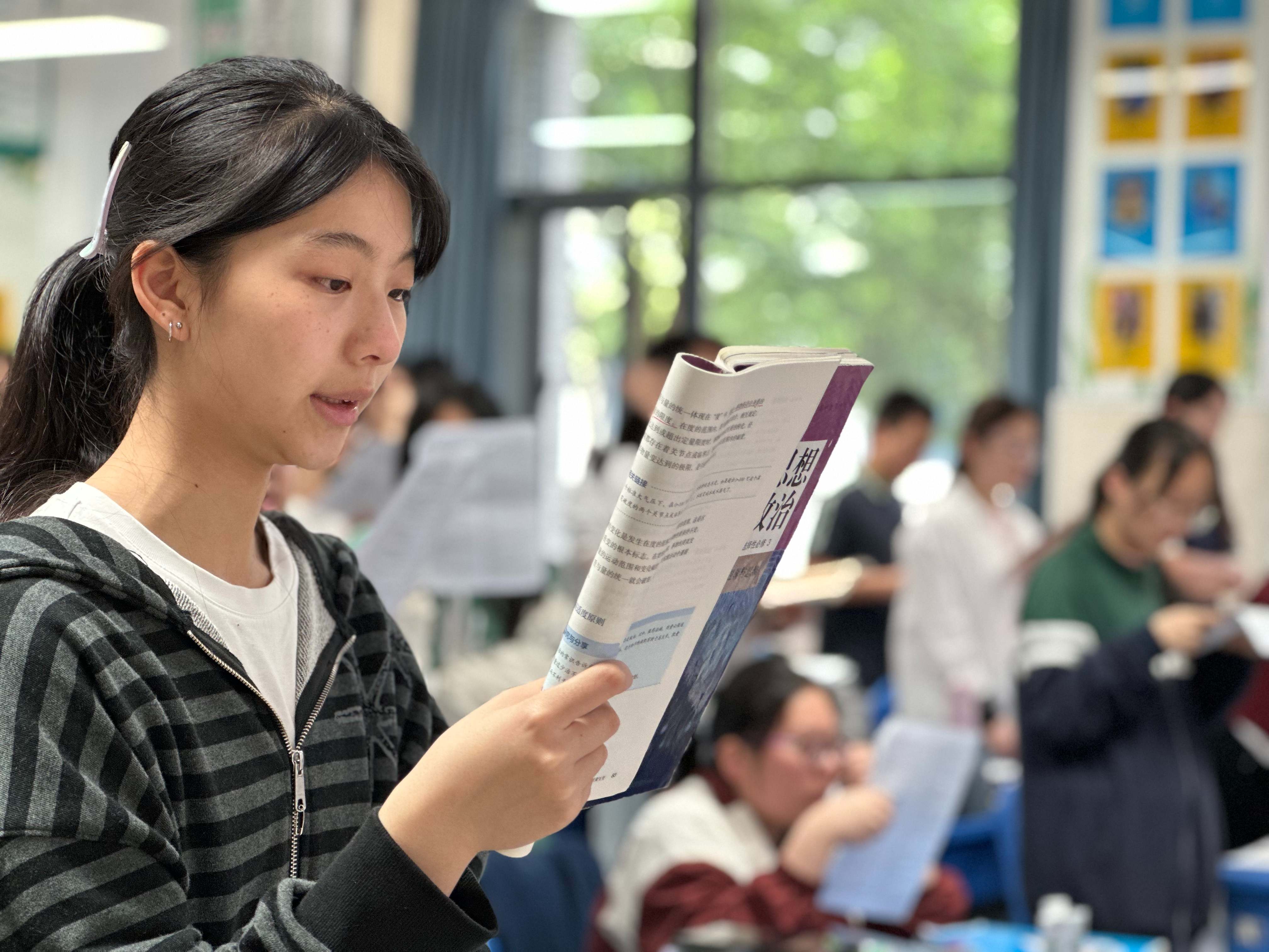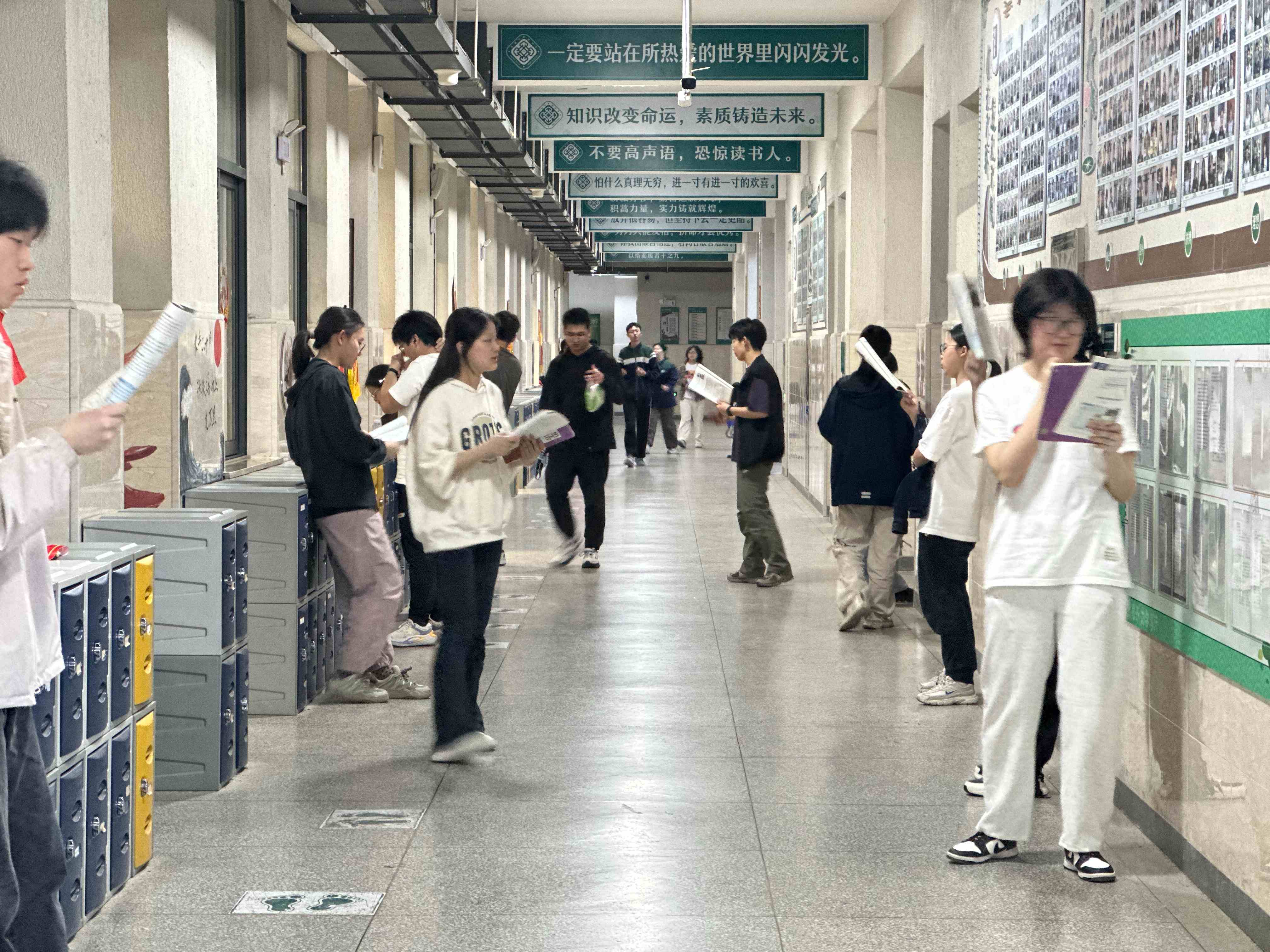 清晨六七点,高三教学楼的院子里、走廊上已站满了晨读的学生。他们或倚窗而立,或来回踱步,手捧书本,专注诵读。英语单词、文言文默写、政治原理……朗朗书声在晨光中回荡,成为校园里最动人的旋律。