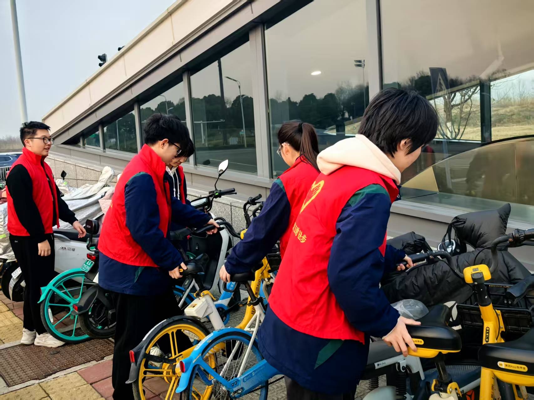 活动开始前,团员们首先领取了统一的志愿者服装,随后前往地铁站开展各项志愿服务工作。到达目的地后,大家首先来到地铁站外,对停放杂乱的共享单车进行整理,确保单车整齐有序,方便市民出行。团员们积极行动,不仅提升了地铁站周边的环境卫生,也为市民的出行提供了便利。