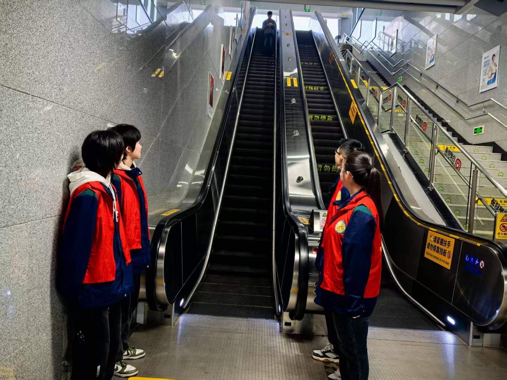 随后,团员们进入地铁站大厅,协助工作人员维护车站秩序。有的团员主动站在车站入口处,帮助指引来往行人,有序疏导人流,确保乘客能够顺利上下车;有的团员则在进站口帮助老年人、孕妇等特殊群体,提供力所能及的帮助,营造了温暖和谐的出行环境。