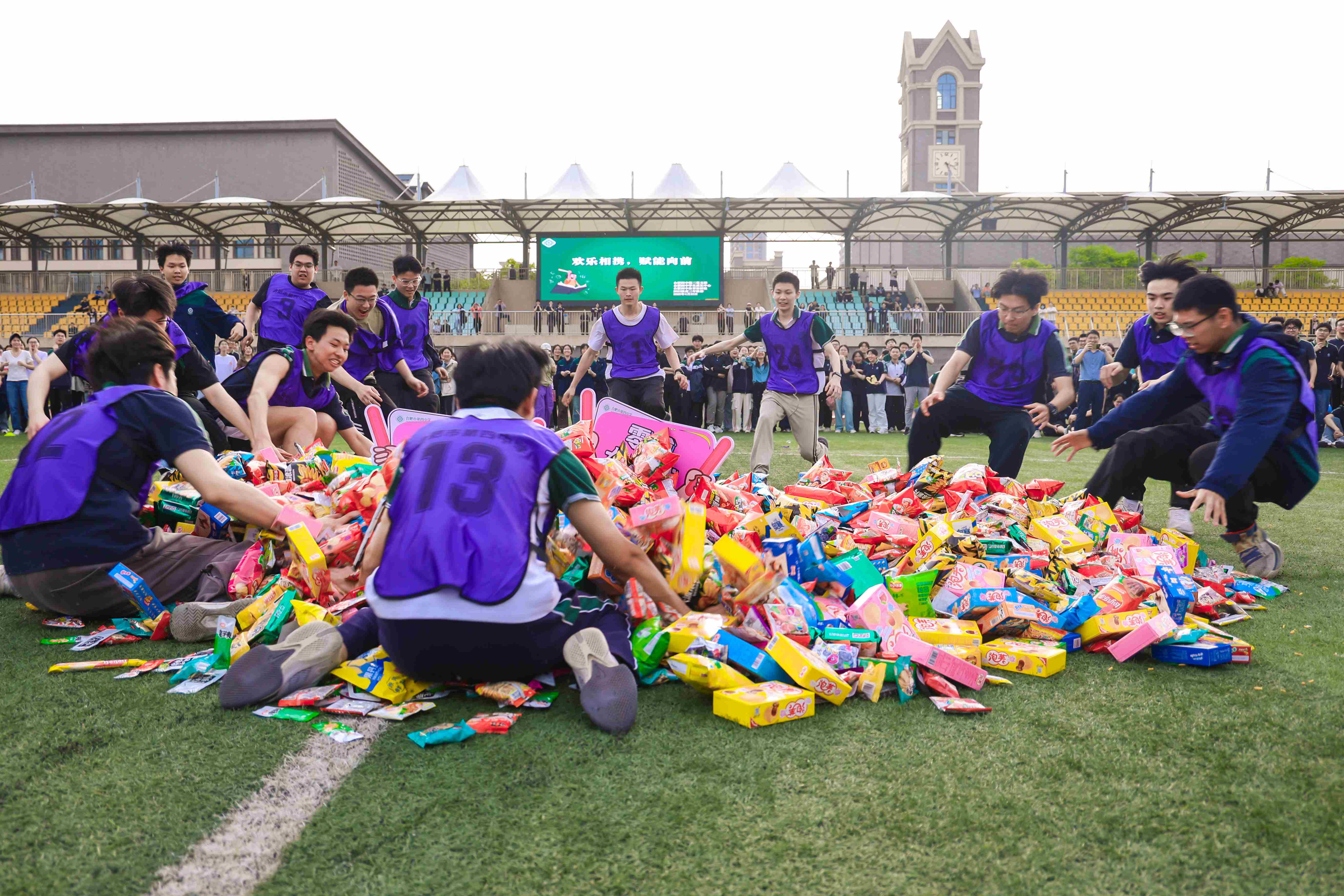 最后的“零食大作战”环节,更是将活动的欢乐氛围推向了顶点。每班六名同学出战,三名男生三名女生,5班班主任于雅萱老师在本班女生不够的情况下,更是将自己作为第二名选手与同学们一起上阵。操场中央摆放着各种各样的零食,形成一个诱人的“零食山”。哨声一响,第一轮开始,24个班的24名男生像离弦的箭一样冲向“零食山”,尽可能抱住最多的零食。经过六轮的疯抢,小山被一扫而空,各班满载而归。同学们在紧张的学习之余享受了一顿美味的零食大餐,更在欢声笑语中放松了心情。场边家长连连拍照:“孩子们抢零食的样子,比刷题鲜活多啦!”