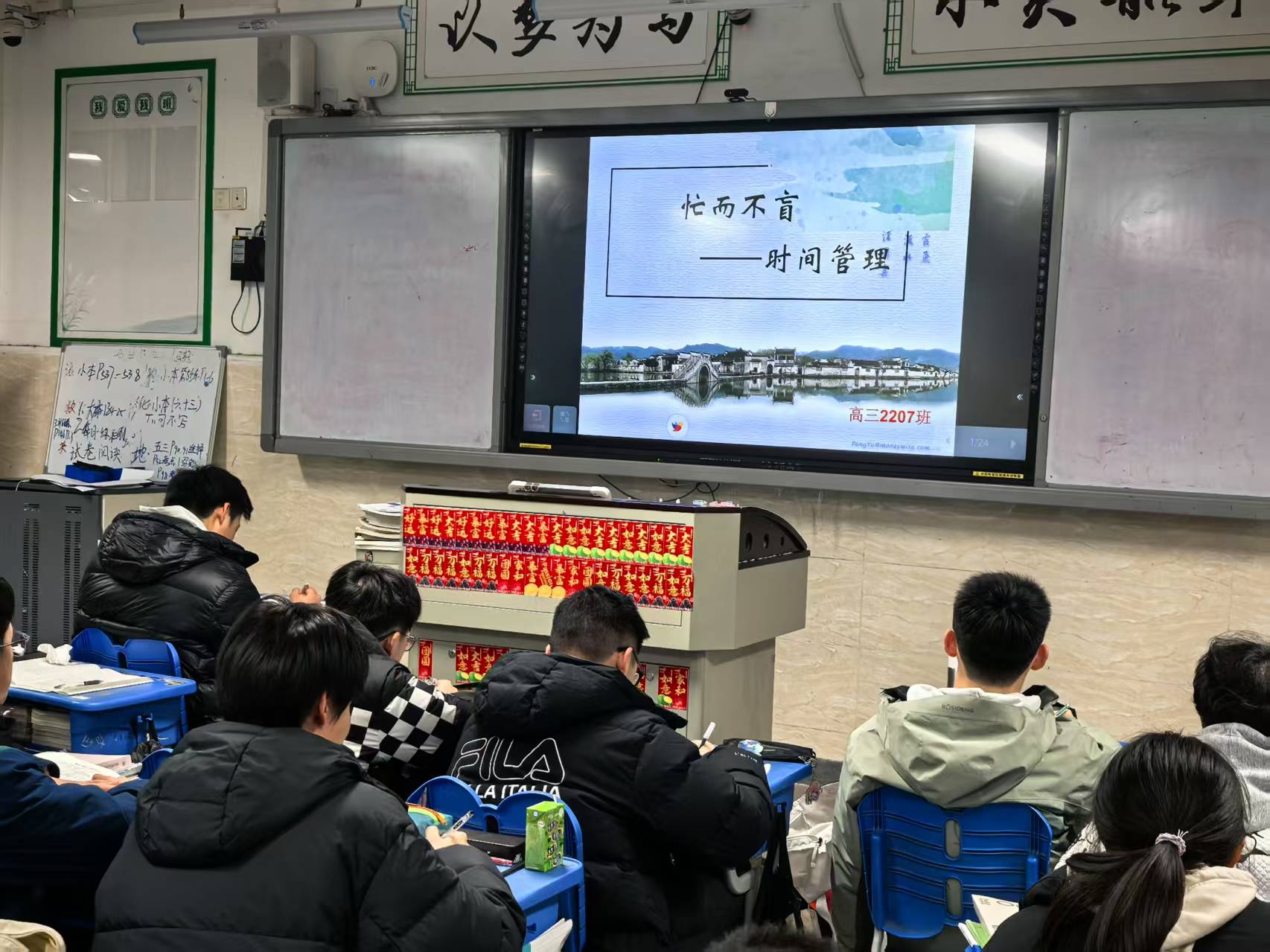 2025年3月3日下午班会课,2207班全体同学在班主任的带领下,开展了一次主题为“管理时间,加强自律”的班会活动。此次班会旨在引导同学们认识到时间的重要性,并通过自律管理,提升个人的学习效率,在高三的复习冲刺阶段,把握好正确的复习方向。