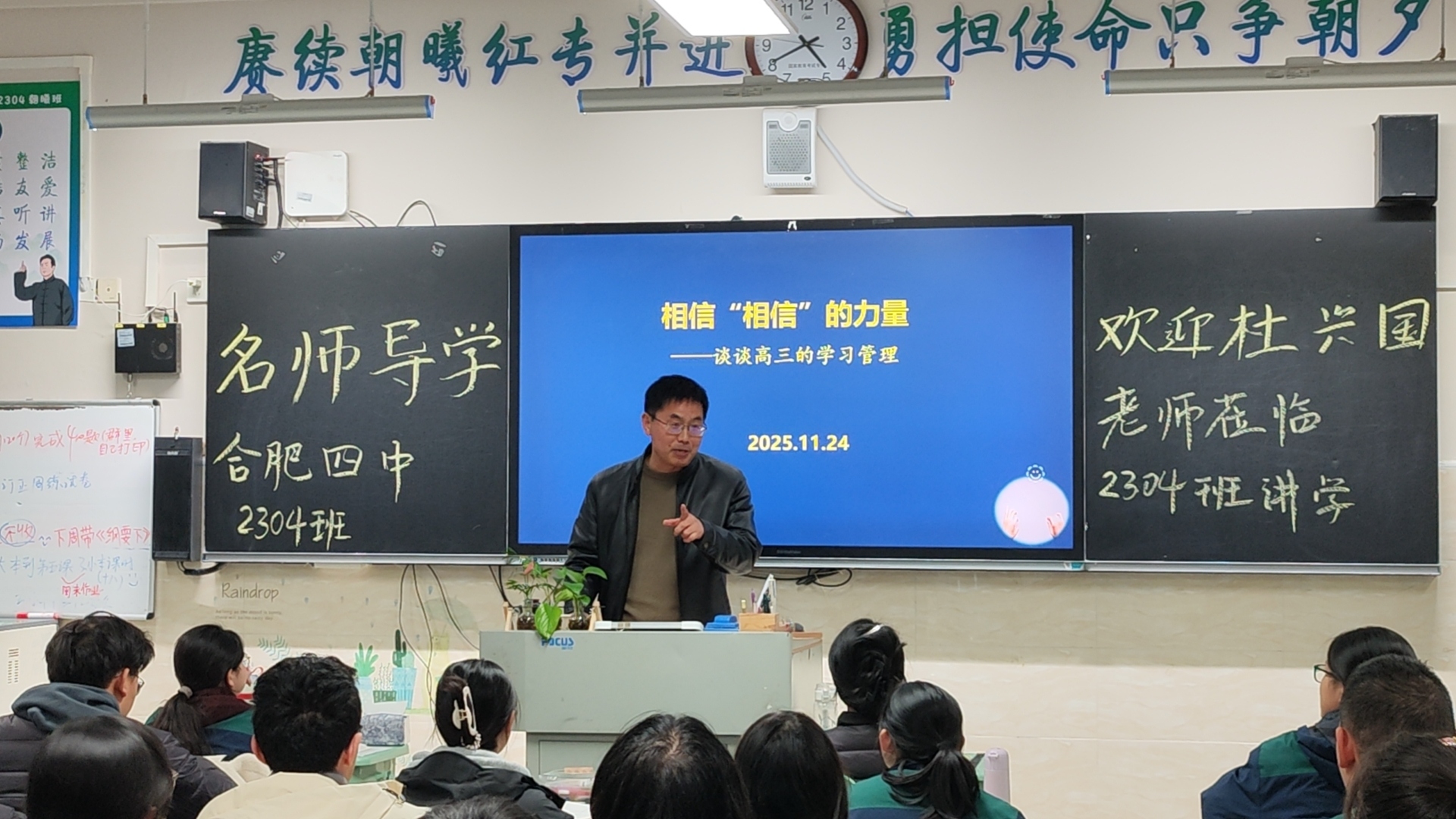 冬日午后的暖阳透过明净的窗棂,为合肥四中2304班的教室披上一层金色的光辉。2025年11月24日下午,这座洋溢着青春气息的高三教室迎来了一场别开生面的思想盛宴。安徽省优秀教师、正高级教师、特级教师杜兴国以《相信"相信"的力量》为题,为正处于高三复习关键期的2304班学子带来了一场深入浅出的专题学法指导讲座。