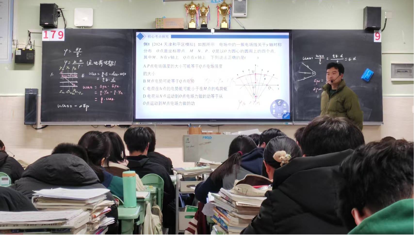 李铁林老师的课程内容为电场中的轨迹问题以及电势能等的判断。李老师先从基础知识入手,详解了电场力做功和电势能的关系,然后再分析典型实例,并鼓励学生上黑板解题,与学生互动积极。