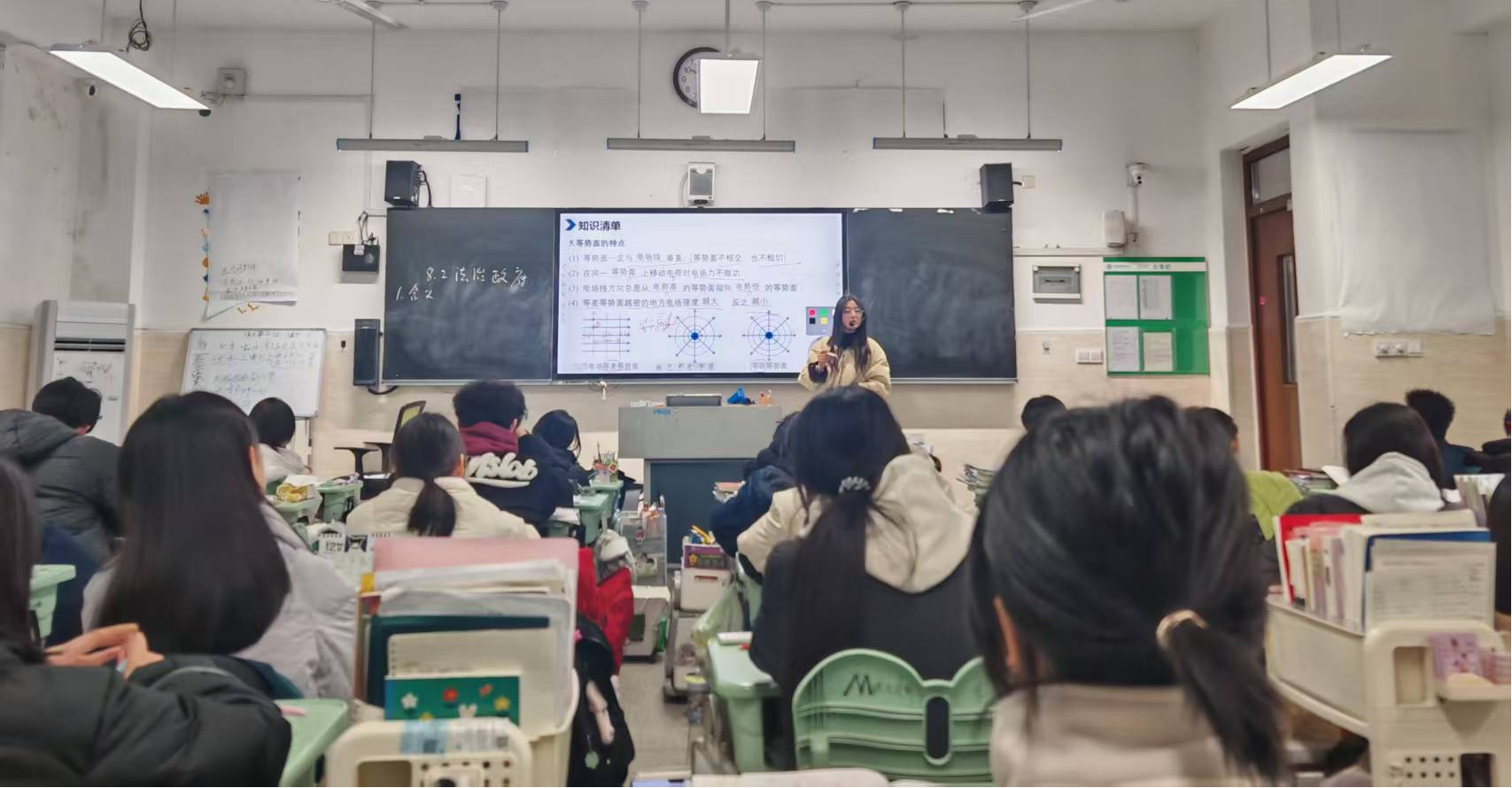 文媛老师的课程内容为电场中的等势面和轨迹问题。从点电荷的电场线和等势面出发,拓展到等量同种和异种电荷的等势面,最后再补充非等量点电荷的等势面特点,然后进行例题分析,学生回答问题积极。