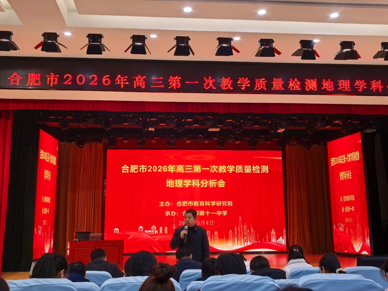 春寒料峭,教研情浓。2026年3月4日,正值新春伊始、冲刺高考的关键节点,合肥第四中学高三地理组闫杰、谢修余赴合肥市第十一中学,参加由合肥市教科院精心组织的全市高三地理第一次教学质量分析研讨会。本次会议旨在通过深入剖析教学质量检测情况,为下一阶段二轮复习指明方向、优化策略。全市高三地理教师代表齐聚一堂,共研教学,共话备考。会议由合肥市地理教研员倪宏忠老师主持。
