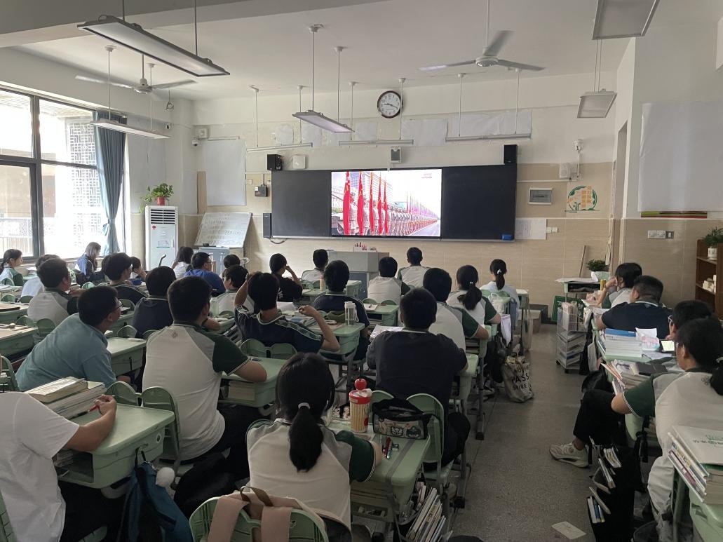 上午9点左右,同学们怀着激动的心情等待阅兵开始。当庄严的国歌响起,全体同学起立,高唱国歌,目光坚定地注视着屏幕。随后,45 个方队依次亮相,整齐的方阵、先进的装备,让同学们不禁发出阵阵赞叹。