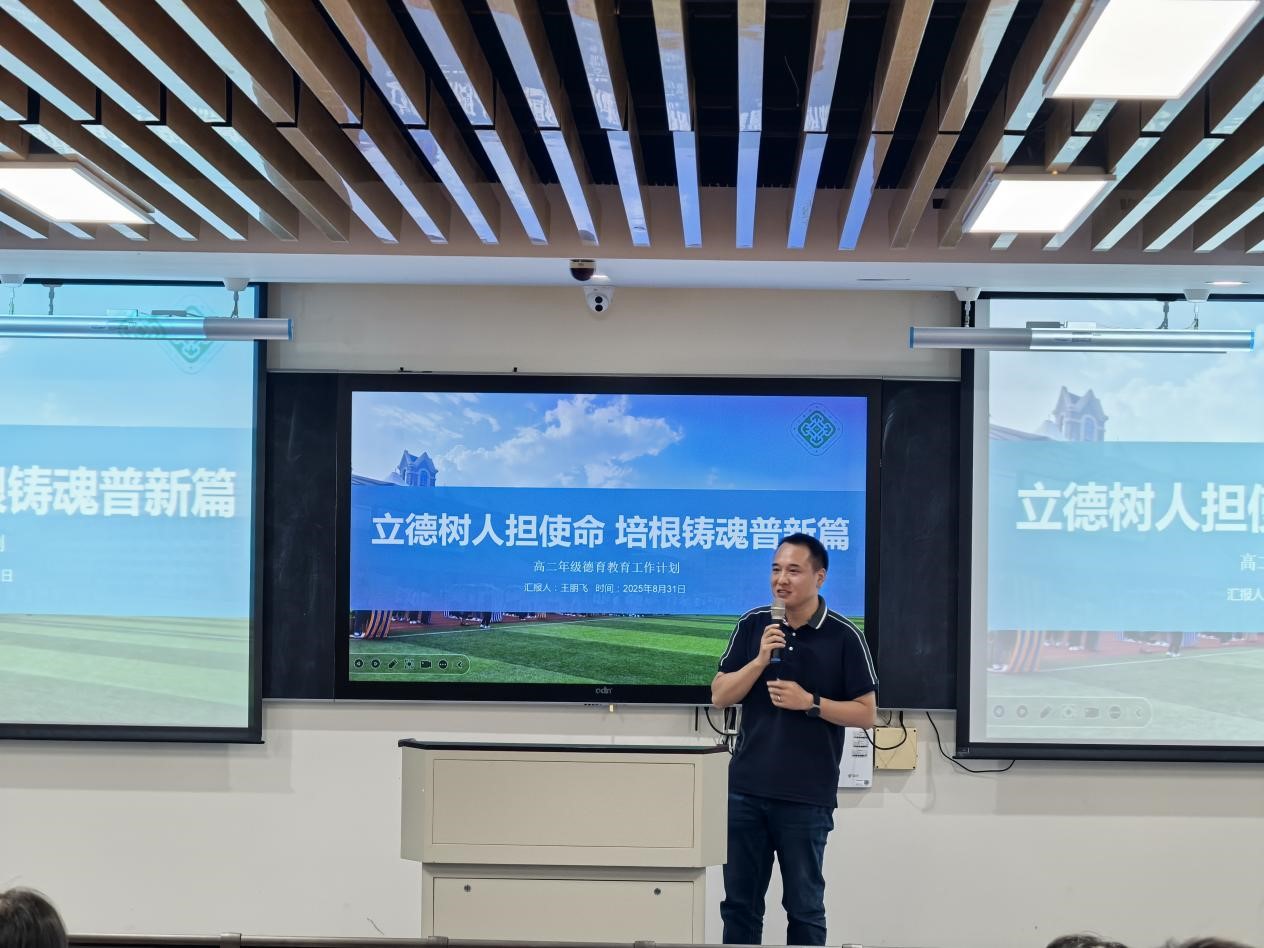 会议伊始,年级部王朋飞副主任首先对上学期德育工作进行复盘总结,王朋飞指出,过去一学年,年级部以“立德树人”为核心,通过主题班会、校园活动、家校协同等举措,有效提升了学生的思想道德素养与行为规范意识。王朋飞指出,本学期德育工作将继续坚持以“立德树人”为核心,紧跟时事,用好教育契机,促进学生的全面发展。同时,王朋飞还详细解读了校园突发事件应急预案,王朋飞指出,德育工作既要关注学生的思想成长,也要守护学生的生命安全,所有教师都是学生安全的责任人,只有筑牢安全防线,才能为教育教学工作提供坚实保障,全体教师要主动关心关爱学生的心理健康,发现问题及时上报,为学生成长保驾护航。