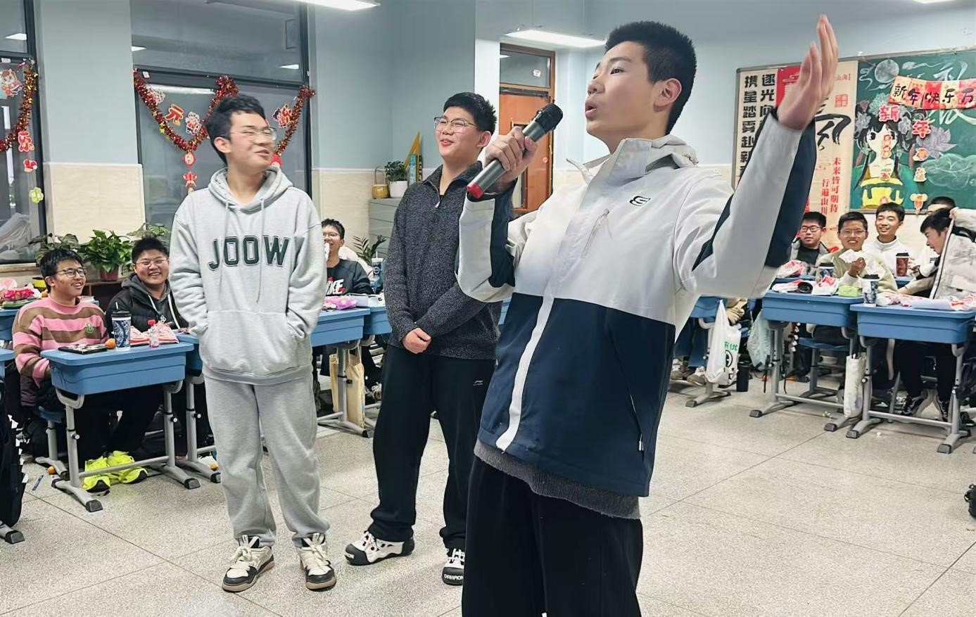 感恩过往凝聚班级力量!联欢会的第二部分在紧张刺激的 《听歌识曲》​游戏中开始了!同学们竖起耳朵,争先恐后地抢答,从经典老歌到流行热曲,展现了广泛的音乐涉猎,每当有同学快速准确地报出歌名,总能引发一片惊叹和欢呼。2403班尤彦君老师别出心裁地设计了“校歌回响”主题,旨在回顾同学们成长的足迹,感恩母校,从而增强集体荣誉感。来自不同初中母校的同学们纷纷登台,用嘹亮的歌声表达对母校的深情与自豪。孙博凡等同学激昂唱响三十八中校歌《我骄傲我自豪》,倪思源等同学深情演绎四十五中校歌《春风化雨桃李芬芳》,陈佳薇等同学则带来了五十中校歌《扬帆远航》。熟悉的旋律回荡在教室中,不仅勾起了同学们对初中美好时光的回忆,更将来自不同学校的力量汇聚于2403班这个新的集体,展现了英才班兼容并蓄、团结向上的精神风貌。