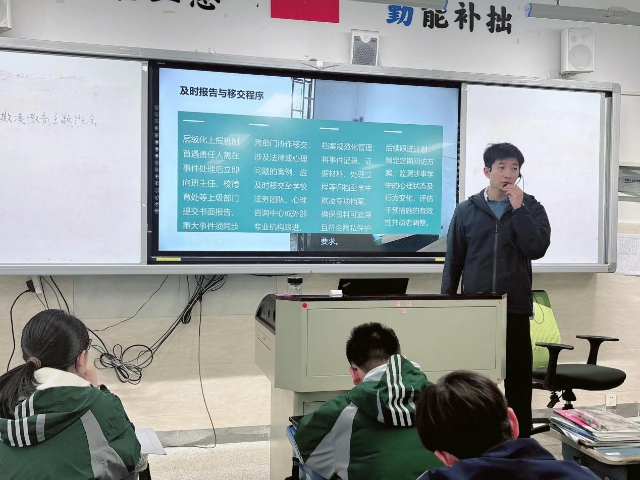 针对欺凌发生后的应对方式,张杰老师重点讲解了首遇责任人处置流程,告知同学们无论身为当事人、目击者还是知情者,都有责任和义务第一时间向老师、家长报告,不做冷漠旁观者,主动参与到制止欺凌的行动中。同时,他结合真实案例,耐心教导同学们遇到欺凌时的正确解决方法:要保持冷静,不硬碰硬,第一时间远离危险环境,及时向师长求助,学会用法律和规则保护自己,绝不以暴制暴,也绝不默默忍受,让同学们掌握了实用的自我保护技巧。