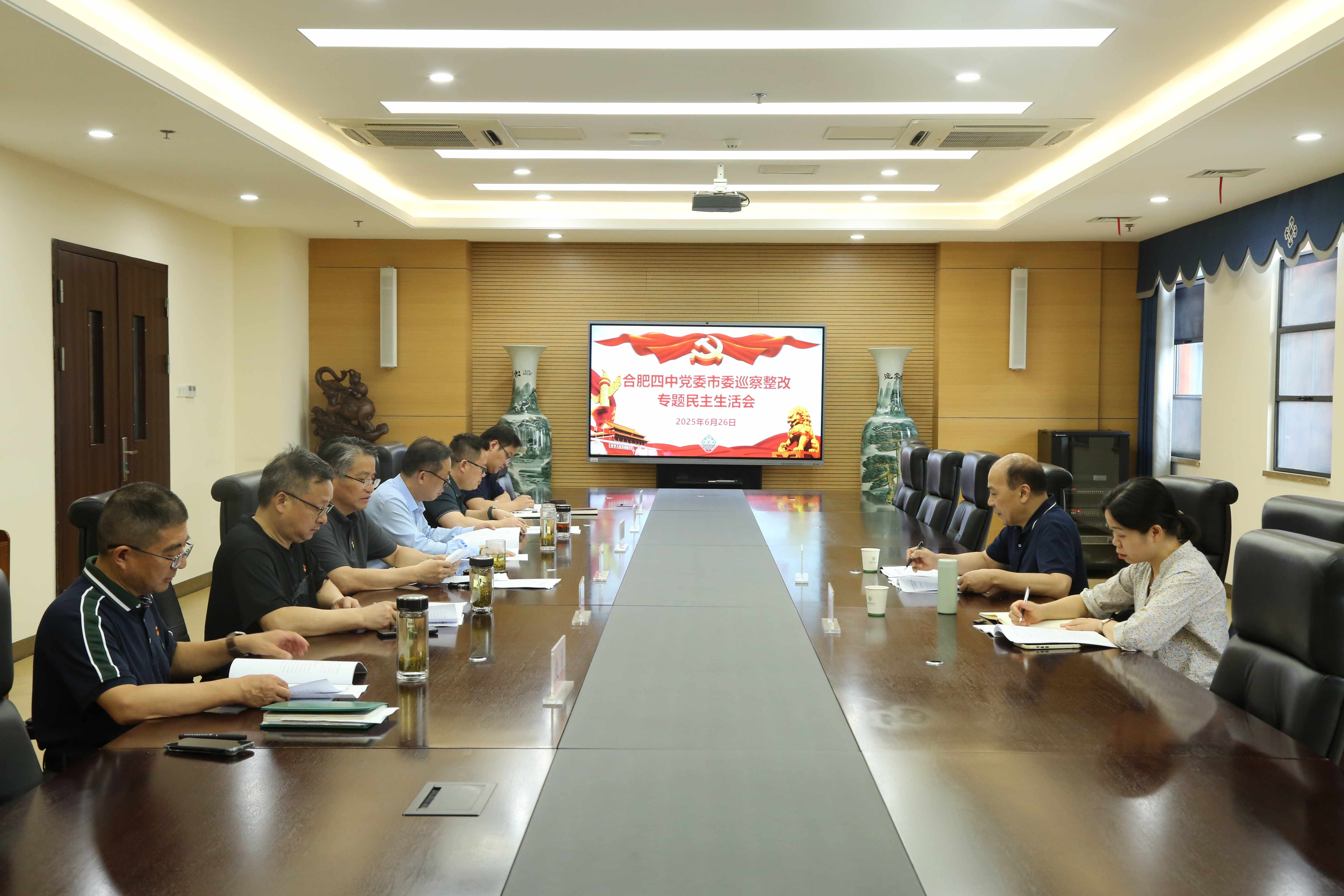 2025年6月26日上午,根据市委第九轮巡察工作整体安排,合肥四中党委召开市委巡察整改专题民主生活会。市教育局四级调研员张承冲、市纪委监委驻市教育局纪检监察组副组长杜莉莉到会指导。合肥四中党委书记熊荣领主持会议。合肥四中党委委员、校长毛晓斌,党委委员、副校长李昌年、彭强、赵勇以及党委委员、办公室主任裴启超等参加会议。