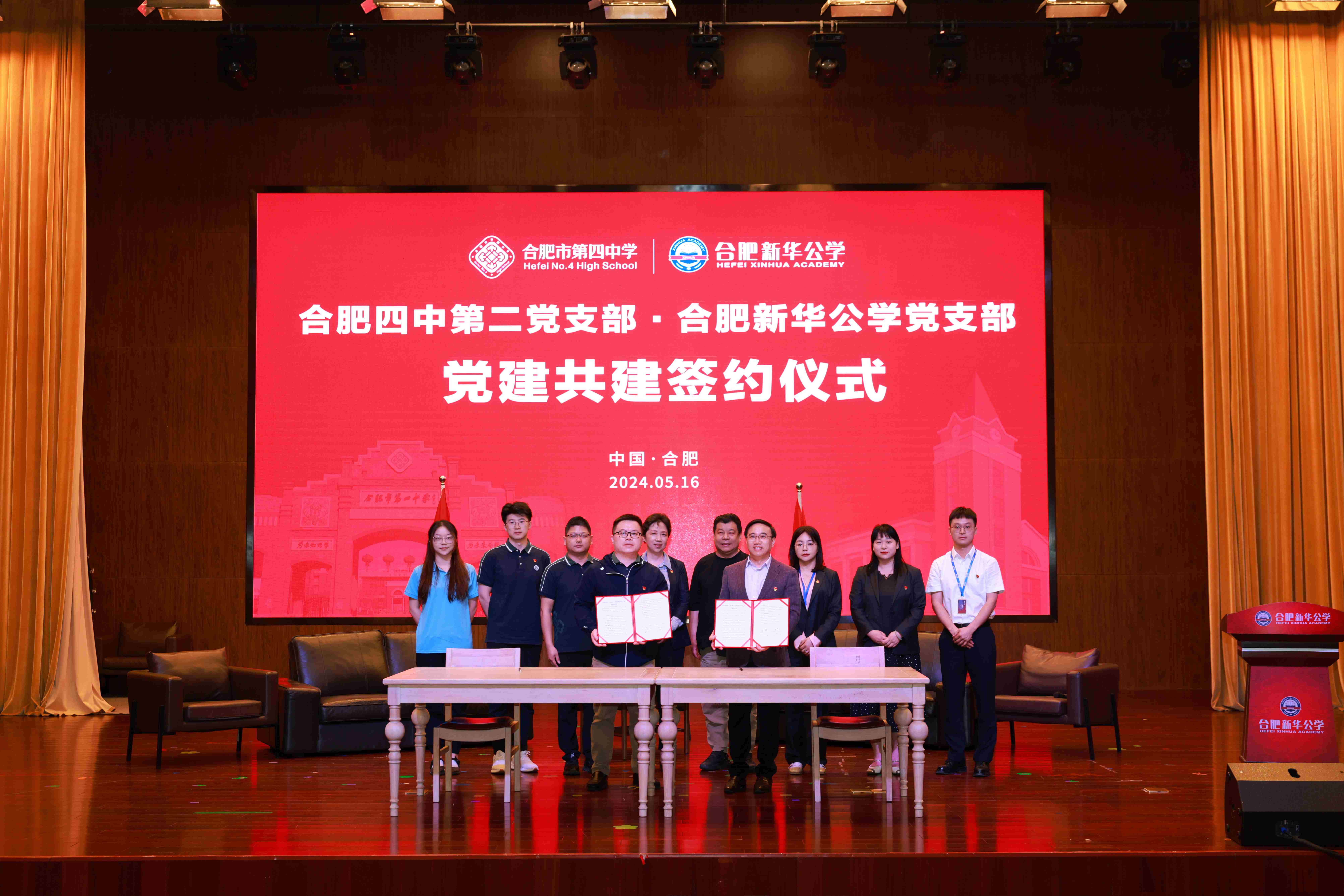 紧接着,合肥四中党委委员、副校长彭强与合肥新华公学党支部书记、总校长秦新春代表两校签署了党建共建协议书。
