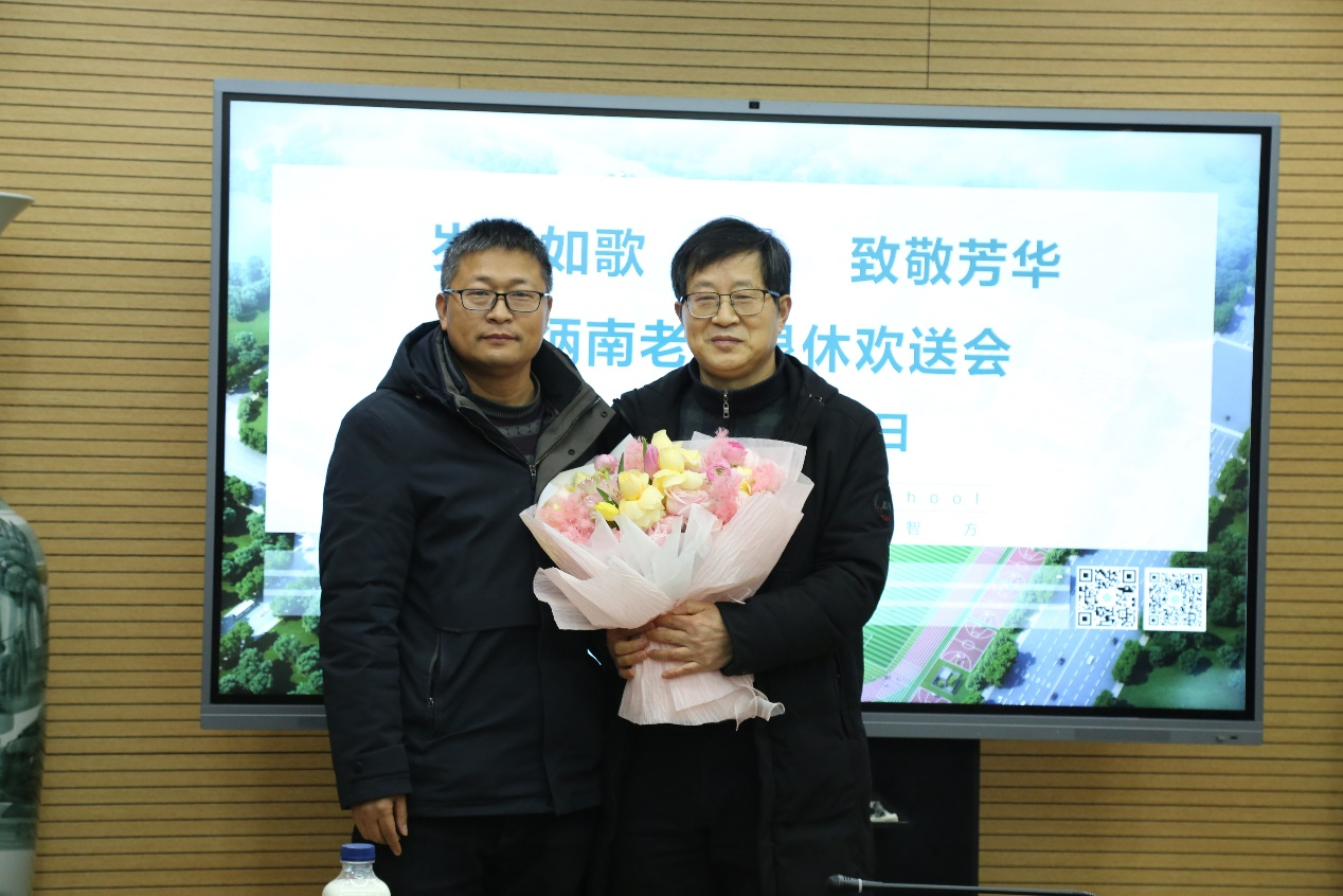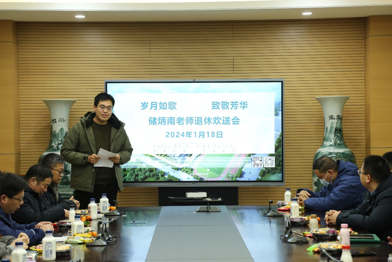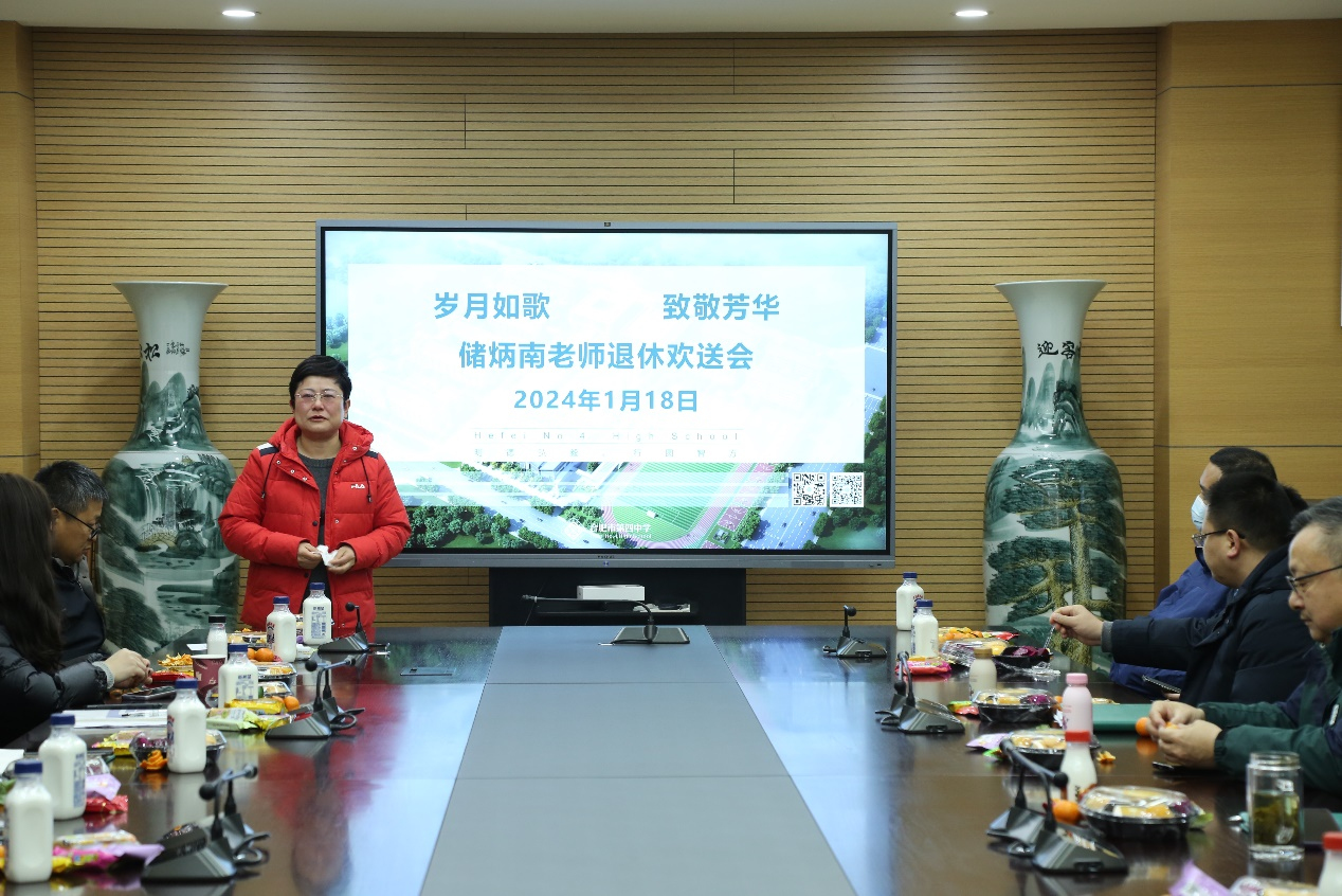 一朝为师,一生无悔。为激励广大教职工担当使命,增强合肥四中退休教师的荣誉感和归属感,2024年1月18日,正值腊八佳节,合肥四中精心组织仪式,为储炳南老师举行了一场隆重热烈的退休欢送会,向在教育一线奋战多年的优秀退休教师致敬。合肥四中党委、校长室、各级部主任、数学学科组代表以及合肥四中大宝代表、学生家长代表参加欢送会,欢送仪式由合肥四中工会主席黄莹莹主持。