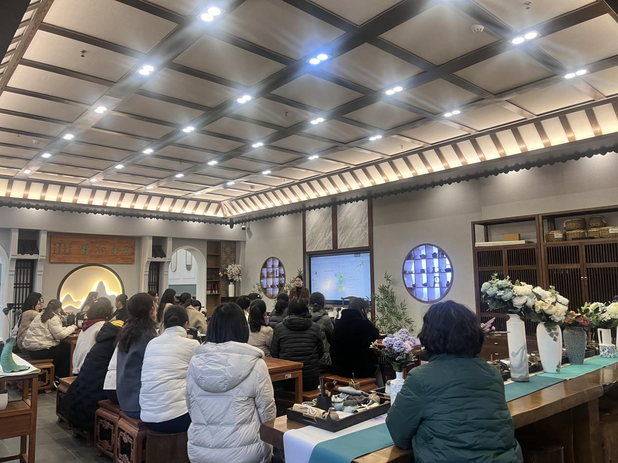 “温杯烫盏·满室生香”活动中,合肥四中语文组教师詹雨薇带领大家开展了一场茶艺活动,詹老师从茶文化的渊源、茶文化的发展、品茶鉴茶等方面,别开生面地带领大家学习茶艺。大家利用案上茶具纷纷效仿,体验冲泡技巧和品茶方式,伴随着升腾的袅袅茶香,大家品鉴香茗,同时共享甜点,丰富多样的下午茶活动在轻松愉悦的氛围中落下帷幕。