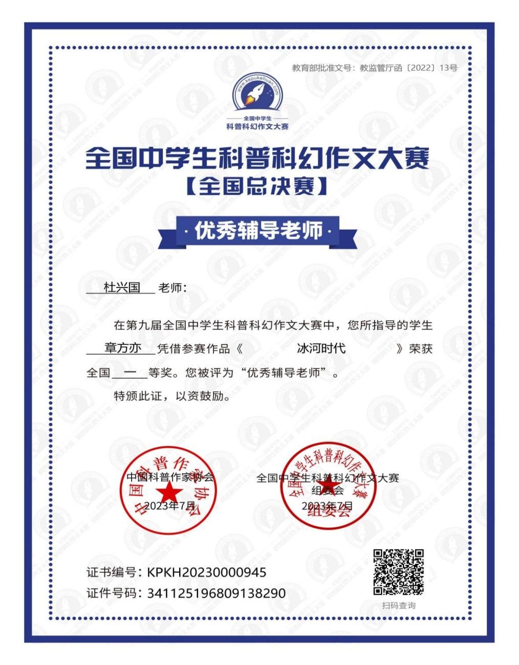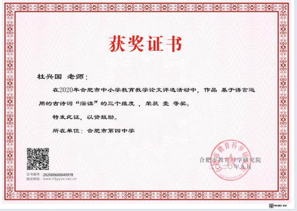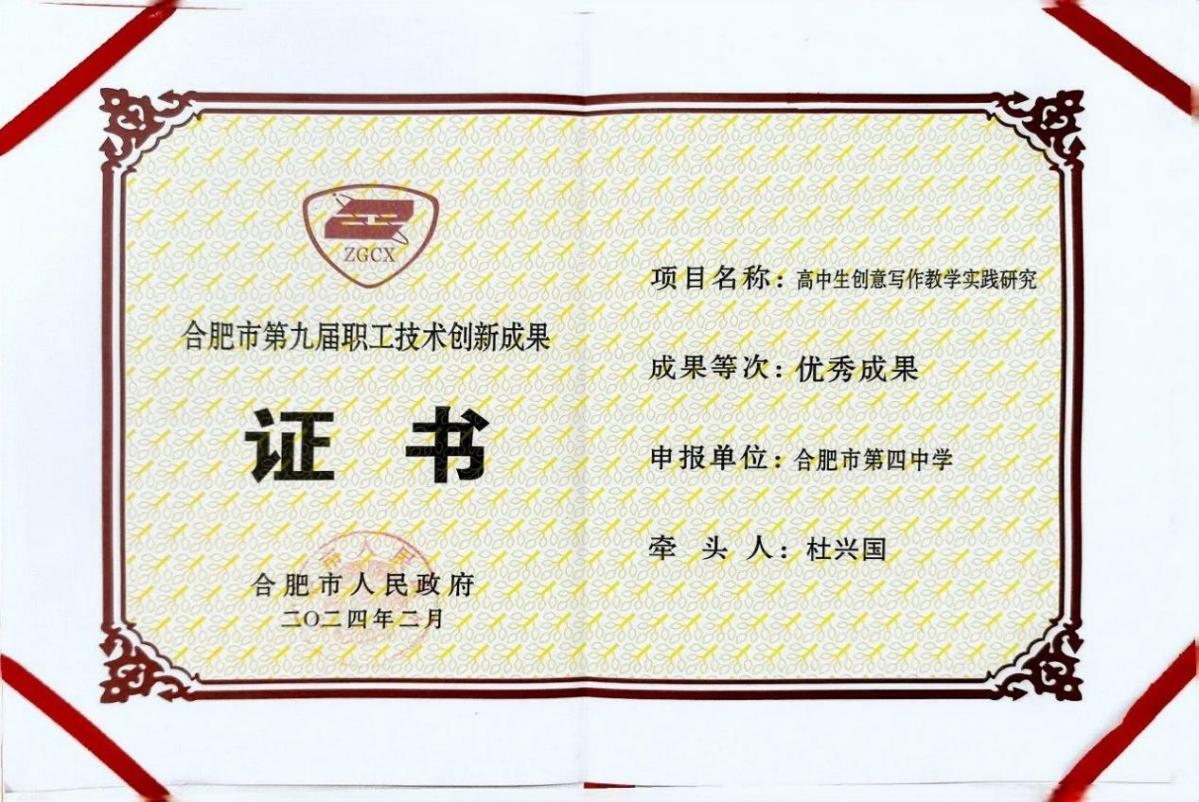 杜兴国老师在日常语文教学中将读与写结合,关注学生创意表达的需求,开展丰富多彩的文学写作活动;同时借助名师工作室统筹校内、校际、社会资源,在高中阶段开展创意写作教学实践,强化学生表达交流,落实立德树人的根本任务。五年来,项目组成员结合一线教学经验,钻研课标,立足课堂,打通生活与语文的界限,针对学生“不会写”“不想写”“写不好”等实际问题,有针对性地构建了完整的高中创意写作教学模式。同时指导学生参加国家级、省市级征文活动,如“语文报杯”“世界华人作文大赛”“ 科普科幻作文大赛”“叶圣陶杯”“安徽省校园读书创作活动”“合肥市读一本好书”等征文活动,成绩斐然,5年来共指导学生获得国家级奖项共11人次,省级奖项120人次,市级奖项246人次,真正促进学生综合素养不断提升,为高校输送人才,发挥“人才泵”作用。