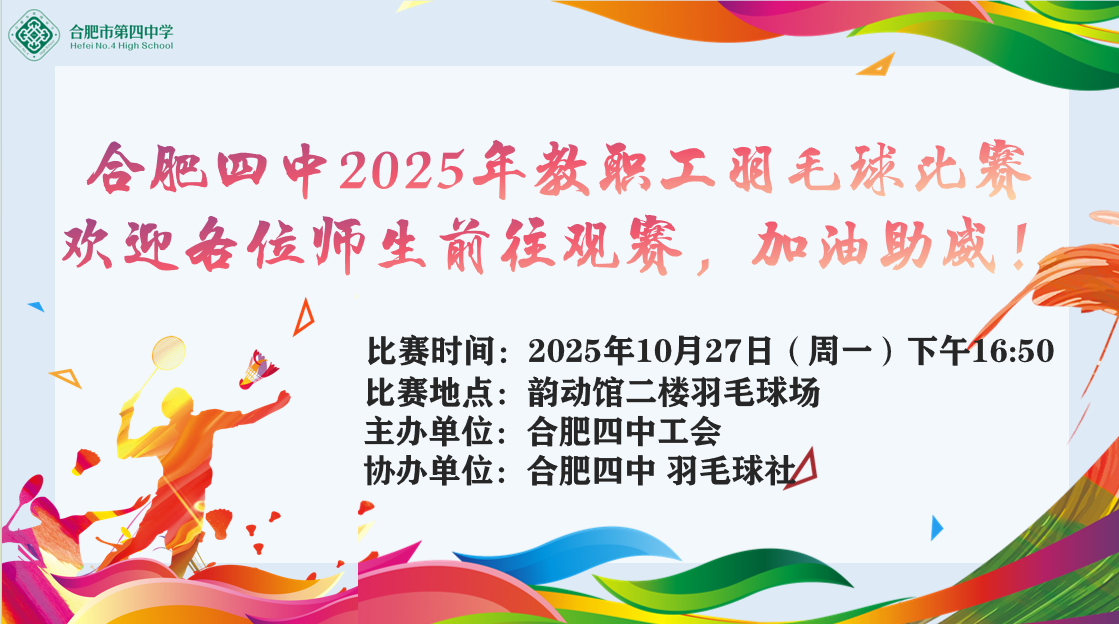 合肥四中工会坚持以服务教职工为工作中心,通过举办各种文体活动,搭建教职工交流平台,不断提升教职工的幸福感、归属感与获得感。本次比赛之后,教工羽毛球赛、篮球赛、趣味运动会等活动将陆续登场。