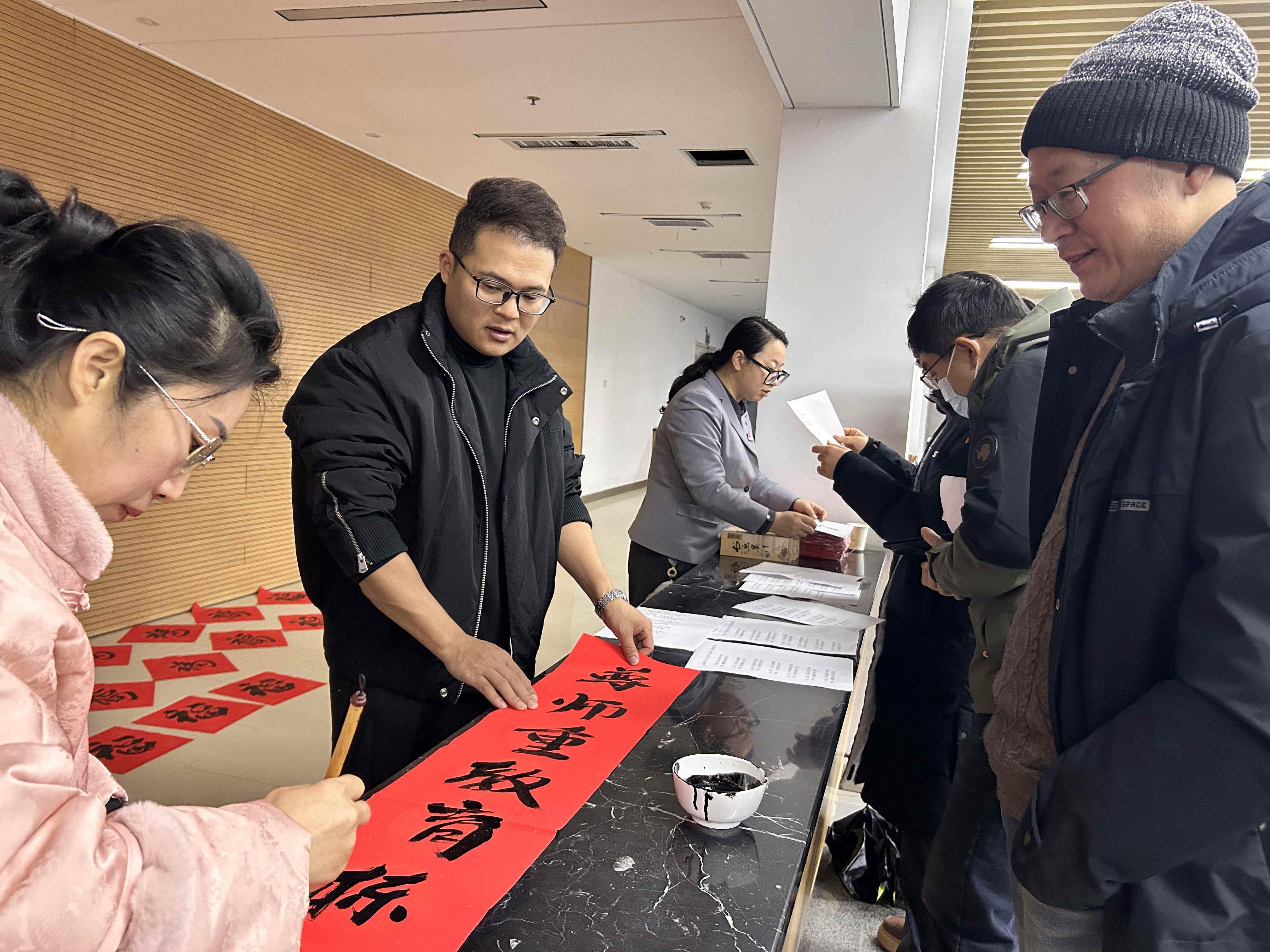 老师们或驻足欣赏书法家的精湛技艺,或与书法爱好者交流心得,或提前备好心仪的春联内容请老师书写。拿到充满墨香的春联和“福”字,老师们脸上洋溢着幸福的笑容,纷纷表示:“手写的春联才有年味儿,工会组织的这个活动太暖心了,让我们提前感受到了浓浓的节日氛围。”