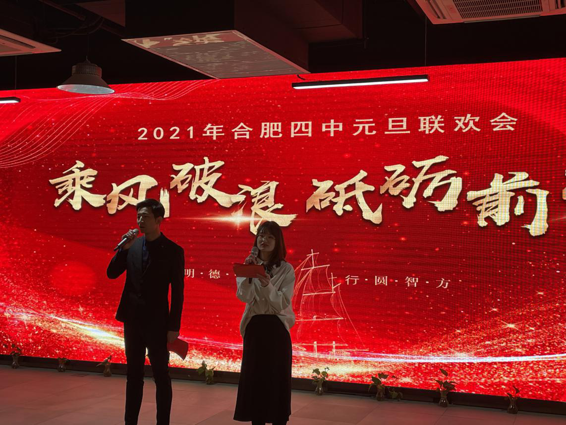 2020年12月31日中午,瑞雪未消,寒风凛冽,但合肥四中四季堂四楼却其乐融融,“春意盎然”,合肥四中“乘风破浪,砥砺前行”元旦联欢会在此隆重举行,全体教职工老师齐聚一堂,共贺佳节。