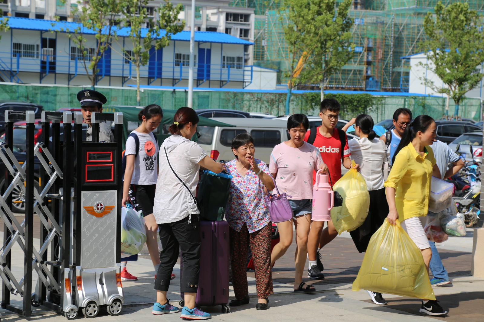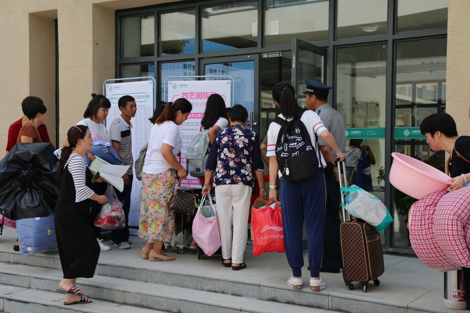 下午两点左右,前来报到、入学的家长及学生便陆陆续续地走进崭新的校园。根据预先在各自导师处所查询到的班级号与寝室号,按照校园里随处可见的指引牌,学生及家长顺利地找到了教室与寝室。许多家庭都是扶老携幼,一起共赴合肥新四中开门迎新的盛典。