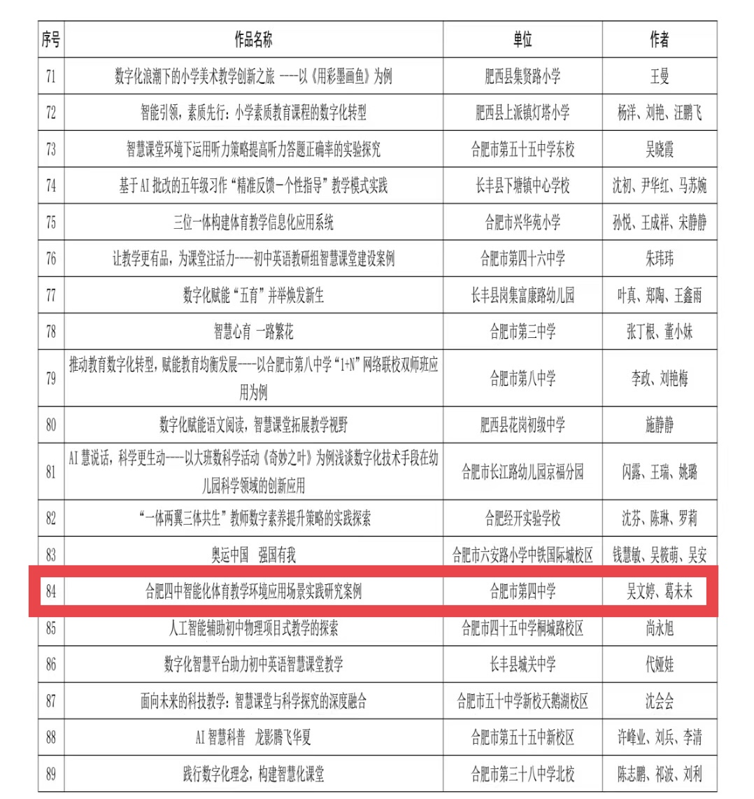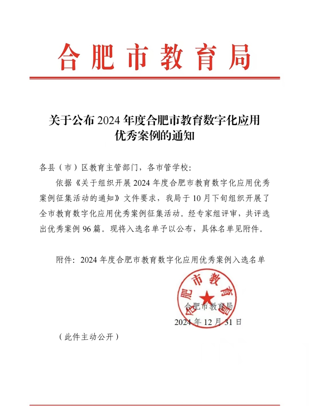 教育数字化转型是推动教育现代化、提升教育质量、促进教育公平的重要途径。依据《关于组织开展2024年度合肥市教育数字化应用优秀案例征集活动的通知》文件要求,合肥市教育局2024年10月份组织开展了全市教育数字化应用优秀案例征集活动,经过专家组多轮评选,最终评出了96篇,其中高中学科共占10篇,单体育学科仅占4篇!按照《通知》要求,被评为优秀案例的将颁发获奖证书,择优编入《合肥市教育数字化应用优秀案例(2024版)》,同时合肥市教育云平台、合肥市教育信息化微信公众号等官方渠道宣传展示。
