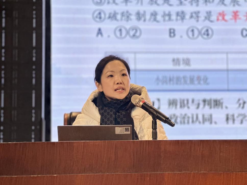 紧接着,合肥四中思想政治学科主任周静老师上台,分享了高三政治学科的二轮备考建议。周老师结合自己丰富的教学经验和本次一模考试的数据分析,提出了针对性的备考策略。她指出,在二轮复习阶段,教师要注重知识的系统整合和深化拓展,引导学生构建完整的知识体系。同时,要加强对学生思维能力的培养,特别是创新思维、逻辑思维和辩证思维等方面。周老师还强调了大单元复习和情境教学的重要性,鼓励教师结合时事热点和生活实际设计教学情境,激发学生的学习兴趣和探究欲望。此外,她还分享了合肥四中在备考过程中的一些创新做法和成功经验,如利用大数据分析学情、开展个性化辅导等,为与会教师提供了宝贵的借鉴。