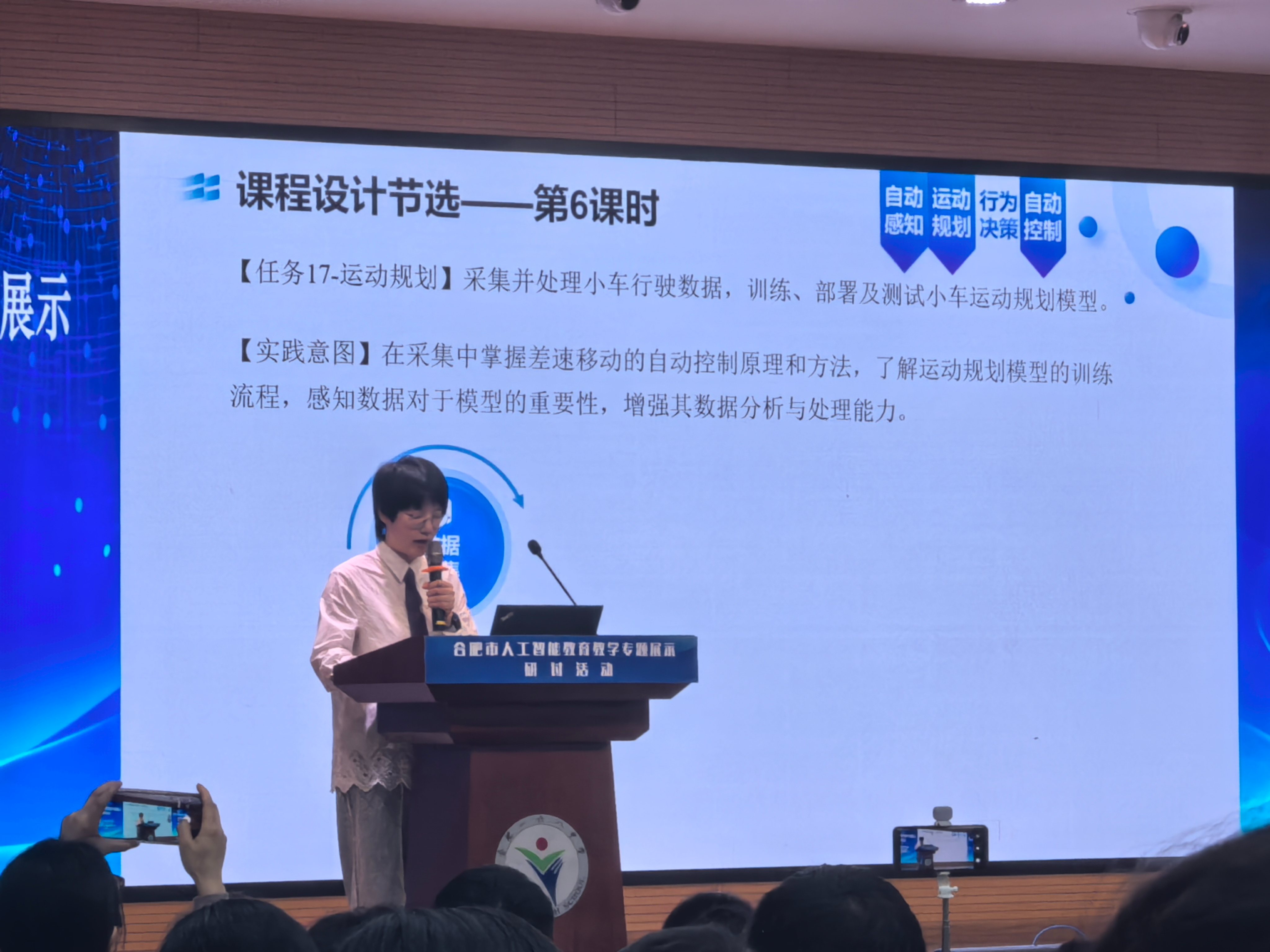 随后,合肥一六八中学隗祎老师登台,以“走进自动驾驶”为主题,分享了小组项目成果。他从环境感知、路径规划到决策控制,完整呈现了自动驾驶技术的核心逻辑,并现场演示小组设计的简易模拟系统,彰显了学生在AI学习中的主动探索与实践能力。该校刘宜萍老师结合上述案例,以《以数据、算法和算力为核心的AI项目式教学实践》为题进行解析,系统介绍了学校如何通过跨学科整合及开源平台应用,构建AI教学体系,为高中阶段人工智能教育提供了可复制的经验。