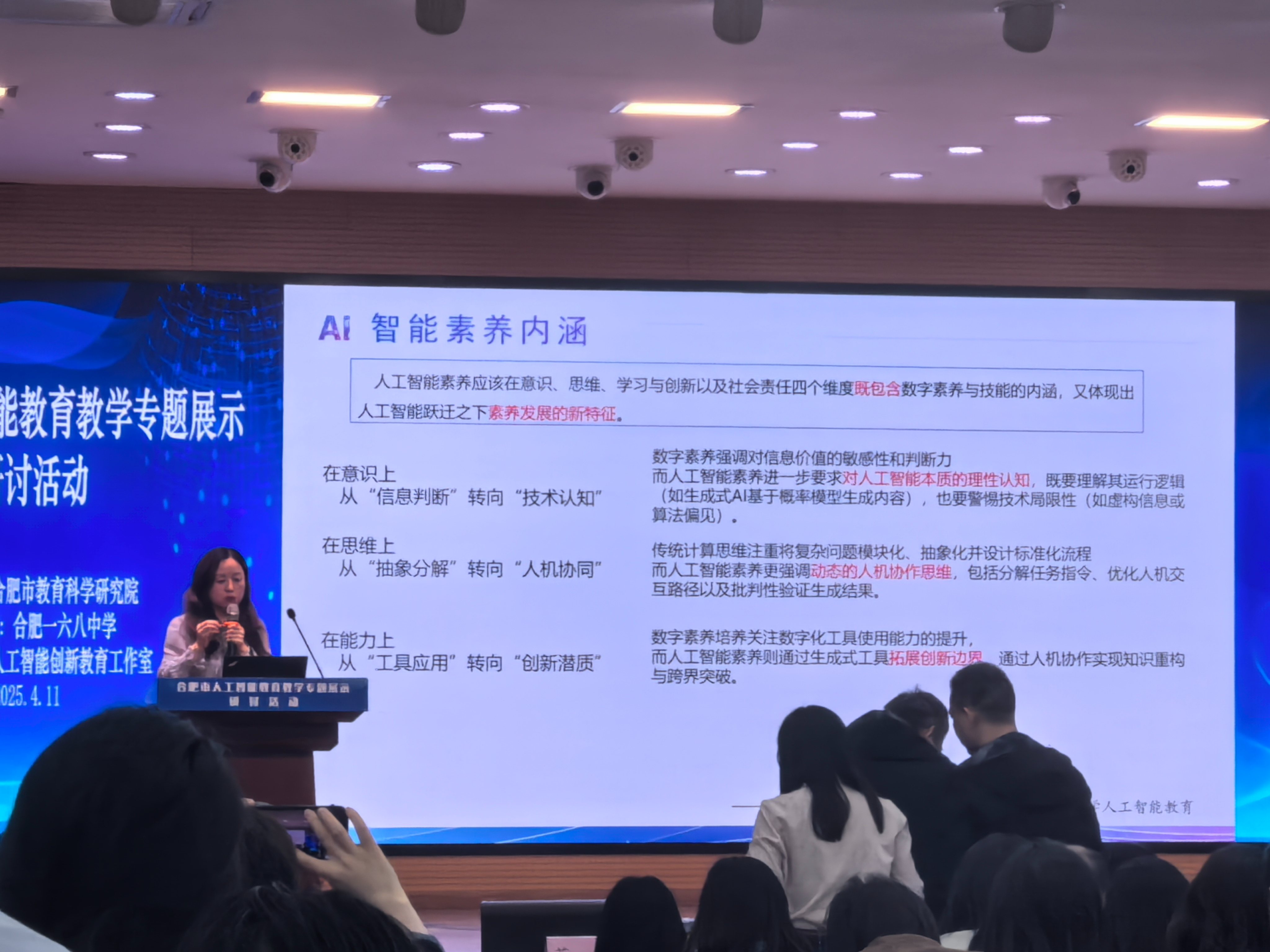 2025年4月11日上午,由合肥市教育科学研究院主办的“合肥市人工智能教育教学专题展示研讨活动”在合肥一六八中学隆重举行,合肥四中技术学科牛亚茹老师参加本次研讨会。活动汇聚全市中小学技术学科教师、教育专家,通过课例展示、课题研讨、专家讲座等形式,共同探讨人工智能教育的前沿理念与实践路径,为全市AI教学发展注入新动能。