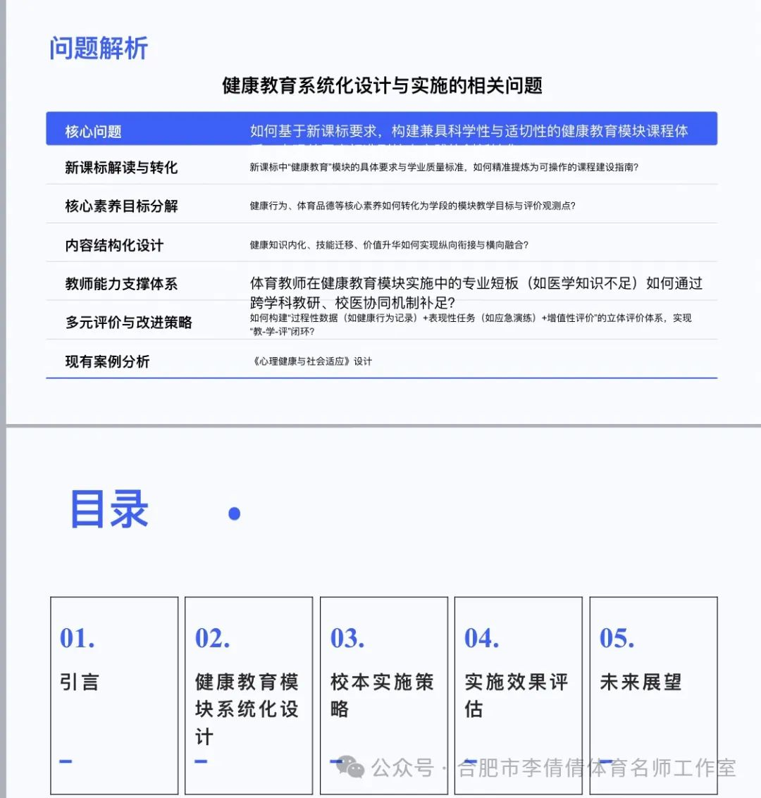 会议伊始,主持人合肥市李倩倩名师工作室领衔人、合肥八中体育学科主任李倩倩老师先介绍了出席嘉宾,然后分析了健康教育项目的实施背景。李老师说,当前健康教育作为学生全面发展的重要载体,亟需通过课程整合与实践创新实现从知识传授向能力培养再到价值升华的转变。接着,李倩倩老师基于新课标的体育与健康课程体系建设专题培训一一健康教育模块的系统化设计与校本实施策略做了报告讲解。李老师从引言、健康教育模块系统化设计、校本实施策略、实施效果评估、未来展望 5 个方面介绍了体育健康课程体系建设,为在场体育教师明确了体育健康课程的概念和建设内容。