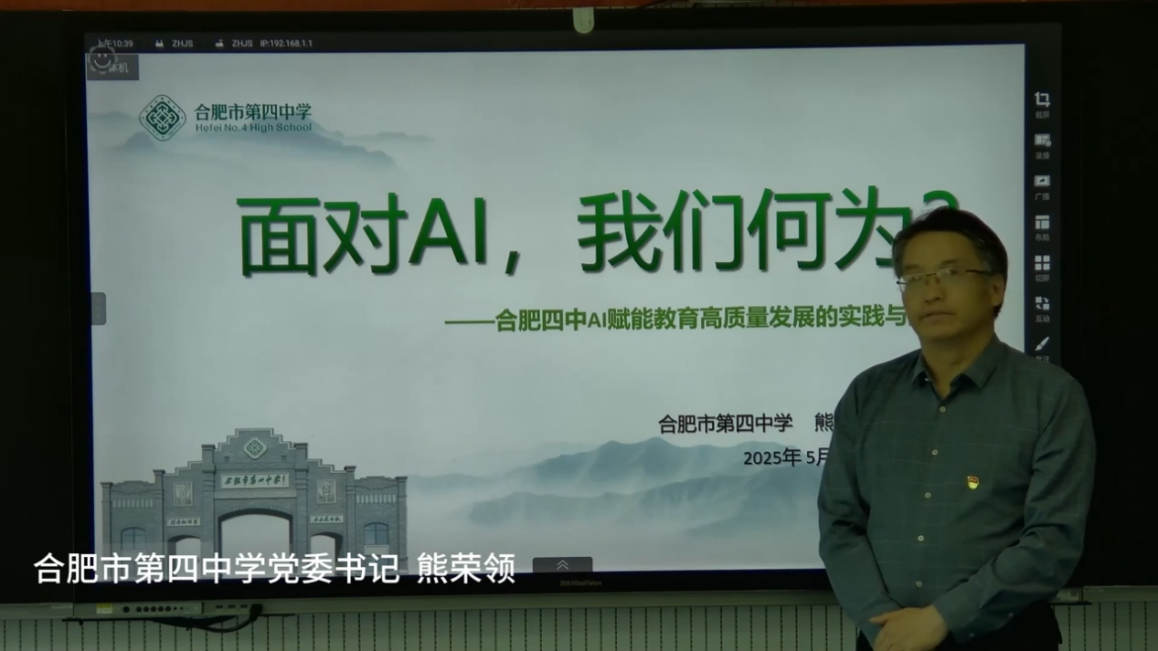 活动最后,合肥四中党委书记熊荣领进行了总结发言。熊荣领强调了AI赋能学校高质量发展的成果。他提到,合肥四中积极响应政策,通过课堂融入AI教育,赋能自主学习。学校智慧校园建设基础良好,教学、管理、评价等各领域均尝试引入AI技术。此外,学校还注重教学策略改革,实施分层作业,提升学生学习体验。同时,学校致力于打造AI赋能矩阵,培养全面发展的人才,与合肥四中办学目标相契合。未来,合肥四中将继续钻研探索AI技术在学校各层面的应用,建设优雅四中、智慧四中、创新四中、幸福四中。