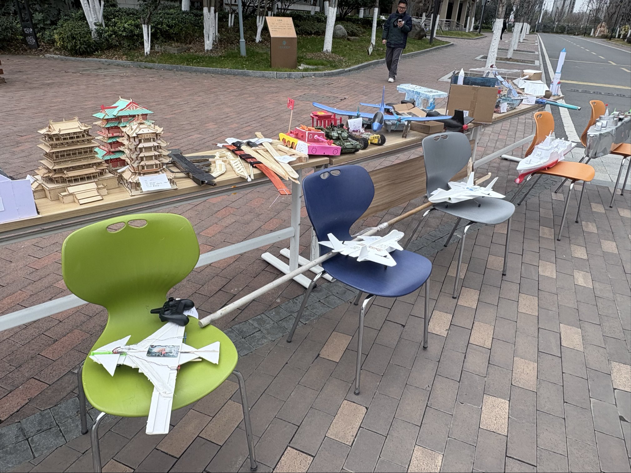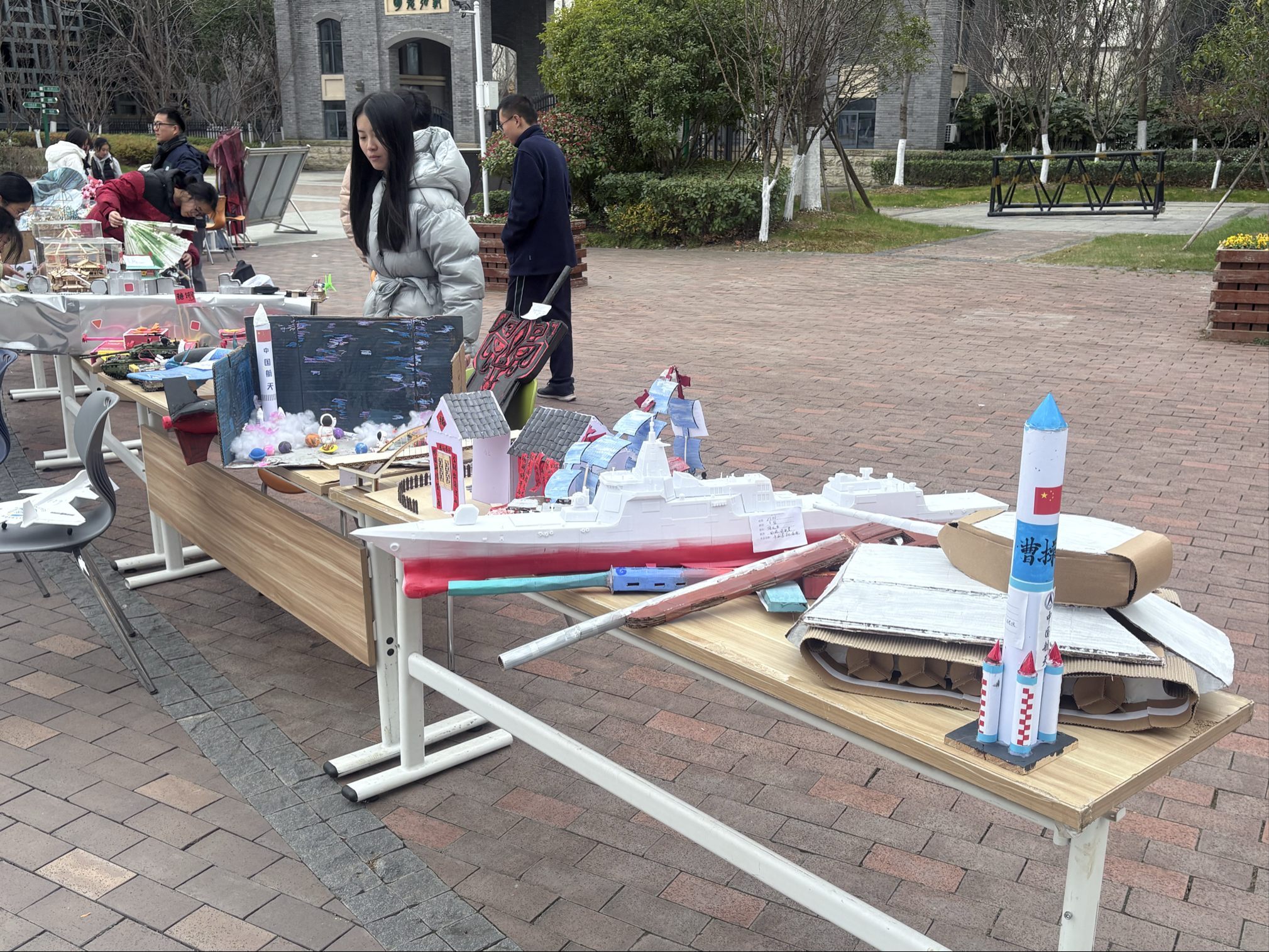 右侧展区则是一片充满科技感与使命感的天地,彰显着利剑出鞘的家国担当。航模在空中翱翔的优美轨迹,勾勒出同学们心中的强军梦想;机甲装置有序运转的机械之美,彰显着科创力量的无限可能。一件件凝聚着奇思妙想的国防军事作品,仿佛是同学们向未来发出的宣言,诉说着新时代少年胸怀天下的凌云壮志,诠释着“强国有我”的铿锵誓言。
