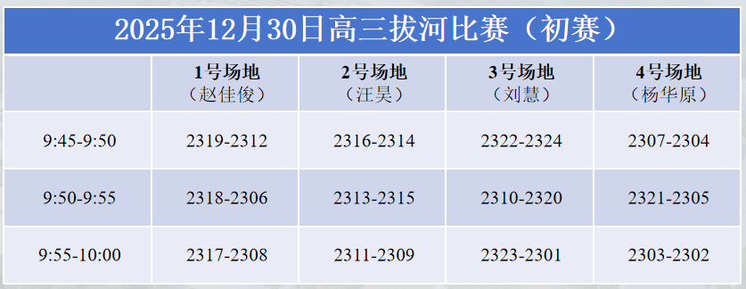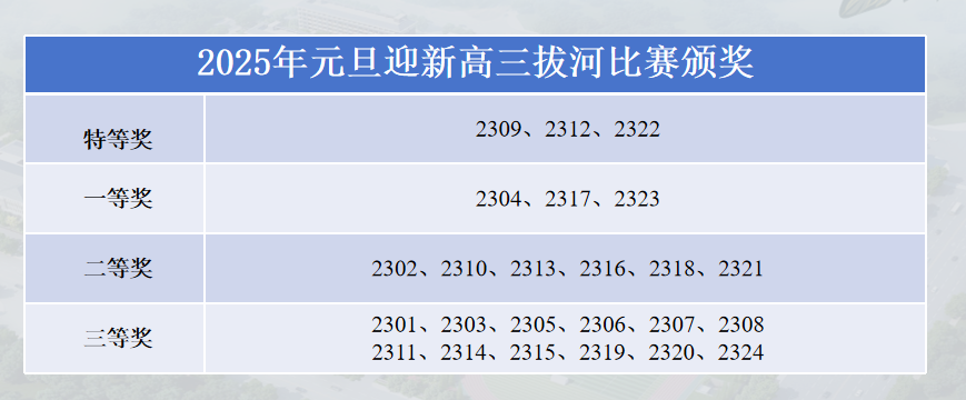 2025年12月30日,是本次拔河比赛的初赛,24支队伍在4片场地上经过激烈角逐最终有12支团队进入了下一轮。31日是第二轮和第三轮决赛,狭路相逢勇者胜,经过反复拉锯,最终2309、2312、2322班进入了前三甲获得了“特等奖”荣誉。