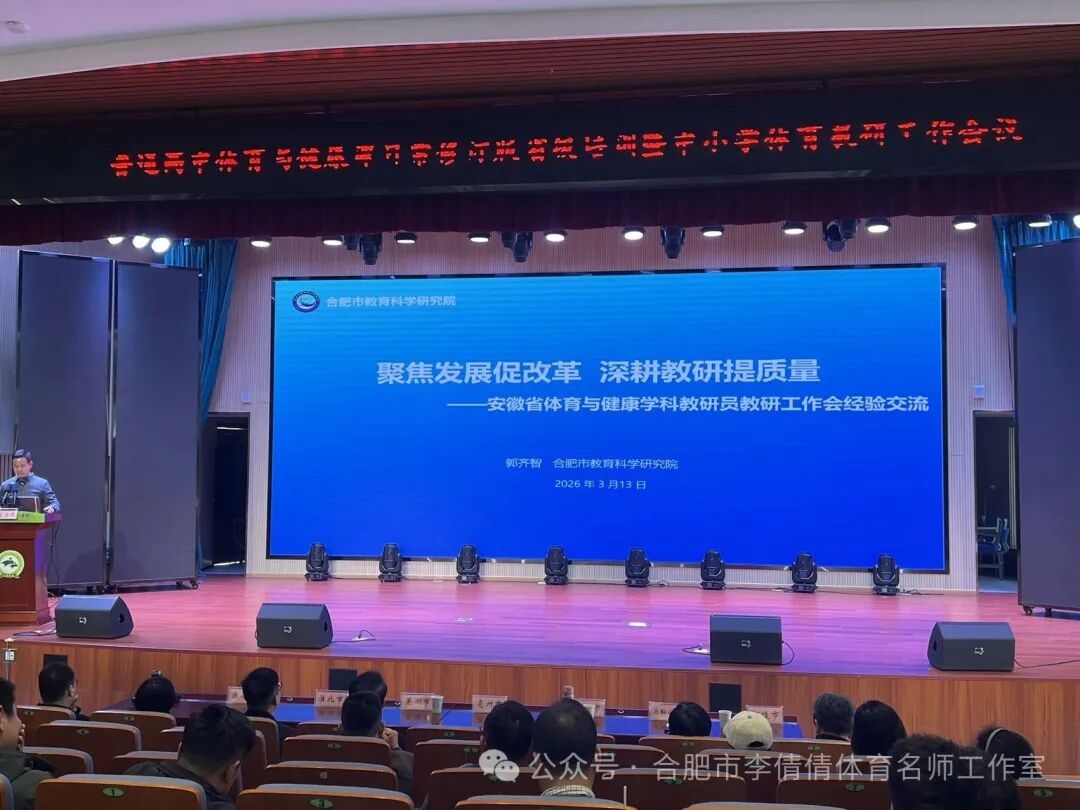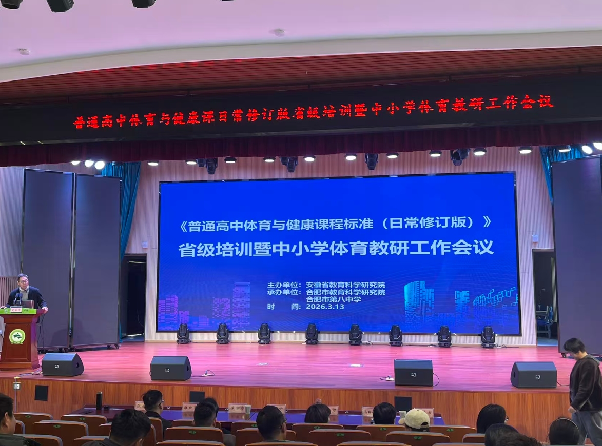 为深入落实普通高中体育与健康课程标准,2026年3月13日下午,在合肥四中体育学科主任吴文婷老师带领下,合肥四中体育组刘慧、葛未未等部分老师在合肥八中百川会堂参加了,由安徽省教育科学研究院主办,合肥市教育科学研究院、合肥市第八中学和合肥市李倩倩名师工作室共同承办的全省普通高中体育与健康课程标准日常修订版省级培训暨中小学体育教研工作会议。本次培训会旨在全面推进安徽省普通高中育人方式改革,推进各市、区体育教研活动高质量有序开展,确保学生体质强健计划落地落细。会议采用“线上+线下”相结合的方式进行,其中线下参会421人,线上学习平台同步吸引5565人观看直播,累计5986名教育工作者共享此次研学平台。