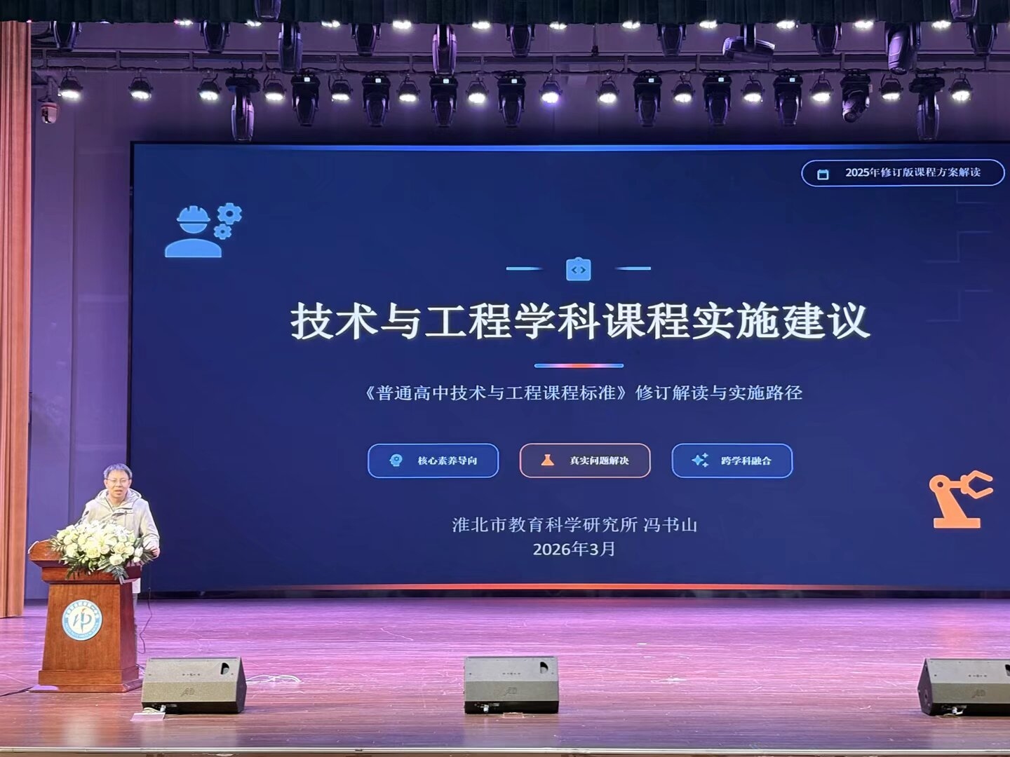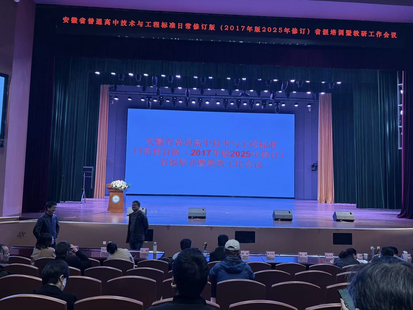 本次培训议程紧凑、内容丰富,多位省内外专家带来了兼具理论深度与实践价值的专题讲座。安徽省教科院胡敏老师围绕高中技术与工程课程标准修订整体情况和主要变化展开深入解读,系统梳理了 2025 年修订版课标在课程定位、内容框架、实施要求等方面的核心调整,为教师准确把握课标精神提供了权威指引;阜阳市第三中学王振强老师聚焦高中技术与工程学科学业质量标准修订解读,结合教学实践与评价要求,详细阐释了学业质量标准的核心内涵与落地路径,为课堂教学与学业评价的有效衔接提供了清晰思路;淮北市教科所冯书山老师带来高中技术与工程学科课程实施建议专题分享,从教学模式创新、跨学科融合、真实情境创设等角度,提出了极具操作性的课程实施策略,为优化课堂教学提供了实践范本;合肥市第一中学汤磊老师则围绕如何开展技术与工程教学实践,结合一线教学经验与校本教研成果,分享了项目式学习、大单元教学等实践路径,为教师开展教学实践创新提供了宝贵参考。