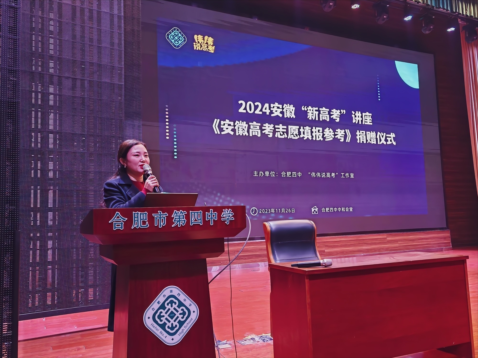 2023年11月26日,金灿灿的银杏叶如金色的地毯在校园延展。下午伟伟说高考走进合肥四中,开展2024安徽“新高考”讲座,旨在帮助家长深入理解新高考政策,掌握志愿填报的技巧,并向现场家长捐赠了《安徽高考志愿填报参考》一书,为家长们提供了一份宝贵的参考指南。本次活动由合肥四中教务处主任朱婷婷主持。