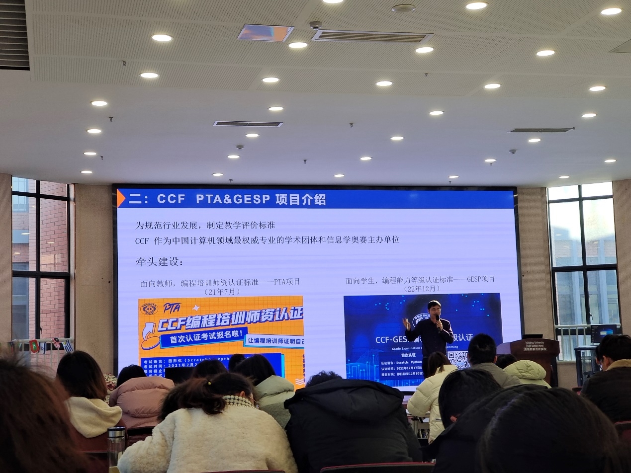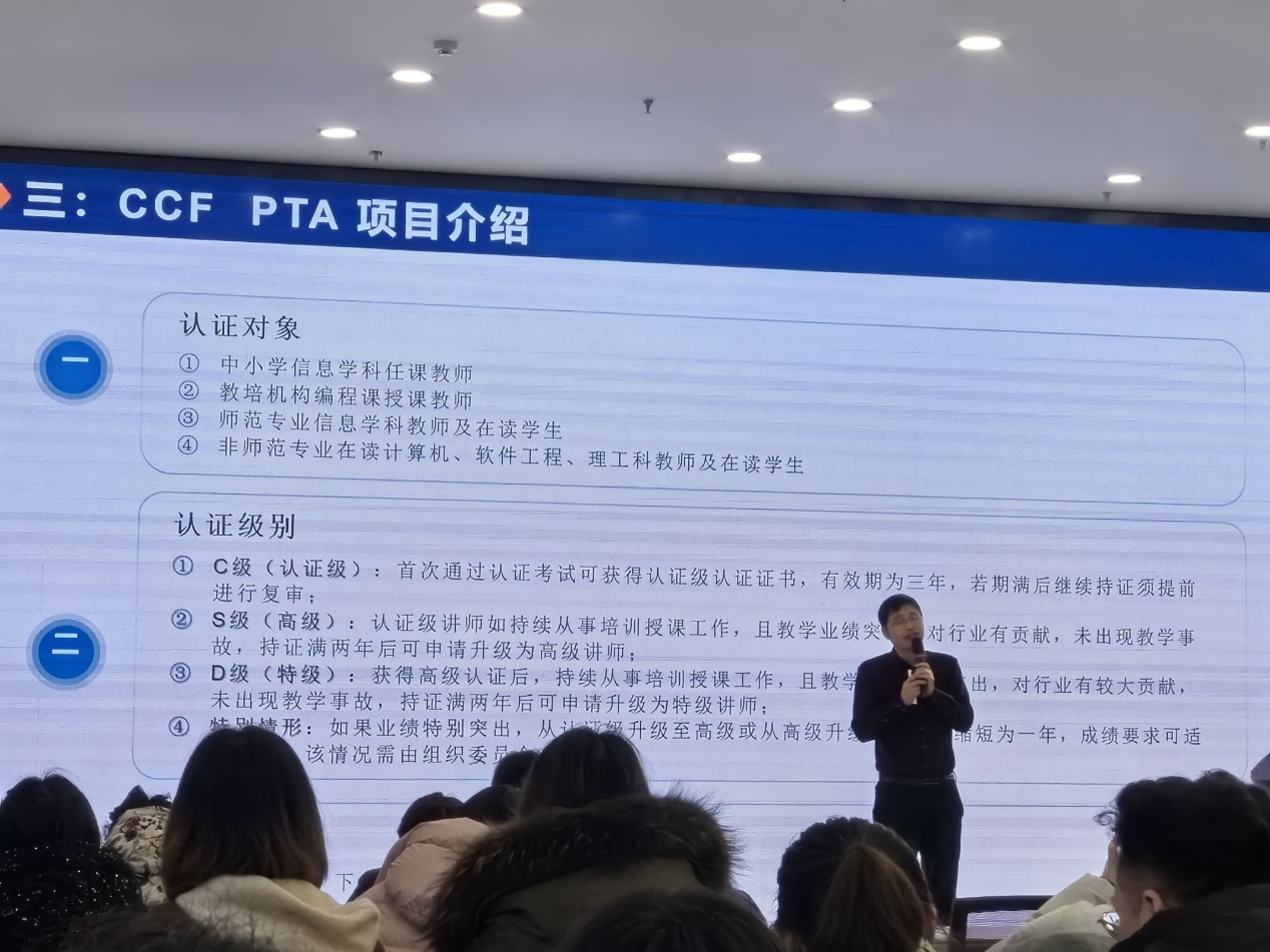 随后,安徽大学汤进教授从中小学编程教育角度介绍了编程教学中教师师资的CCF PAT认证以及学生编程能力的GESP认证方面的内容。