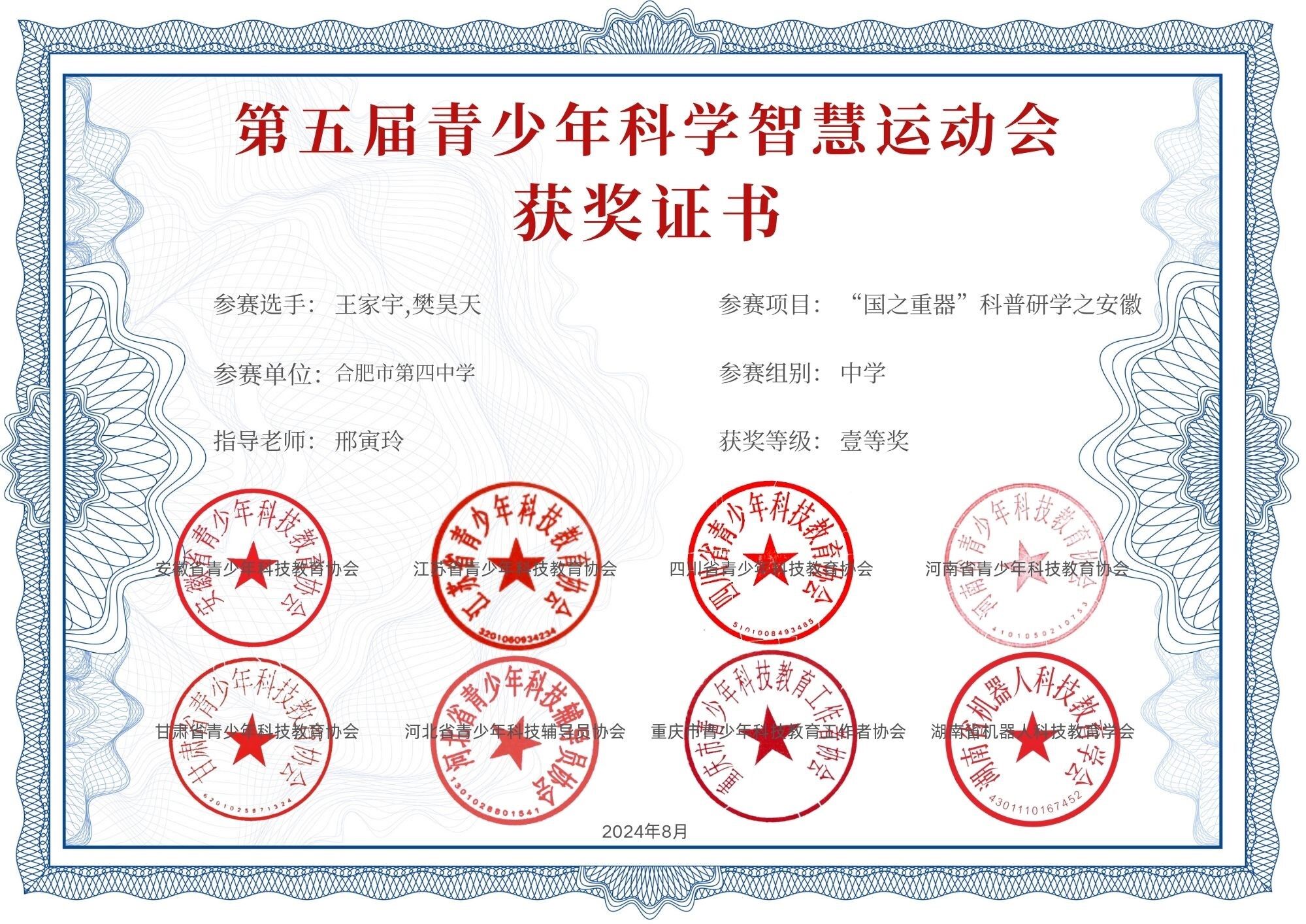 在刚刚落幕的第五届青少年科学智慧运动会上,合肥四中机器人社团展现了非凡的实力和创新能力。其中,由王家宇和樊昊天组成的小组荣获一等奖,而王天祺和葛周航搭档的小组也不甘落后,取得了三等奖的好成绩。