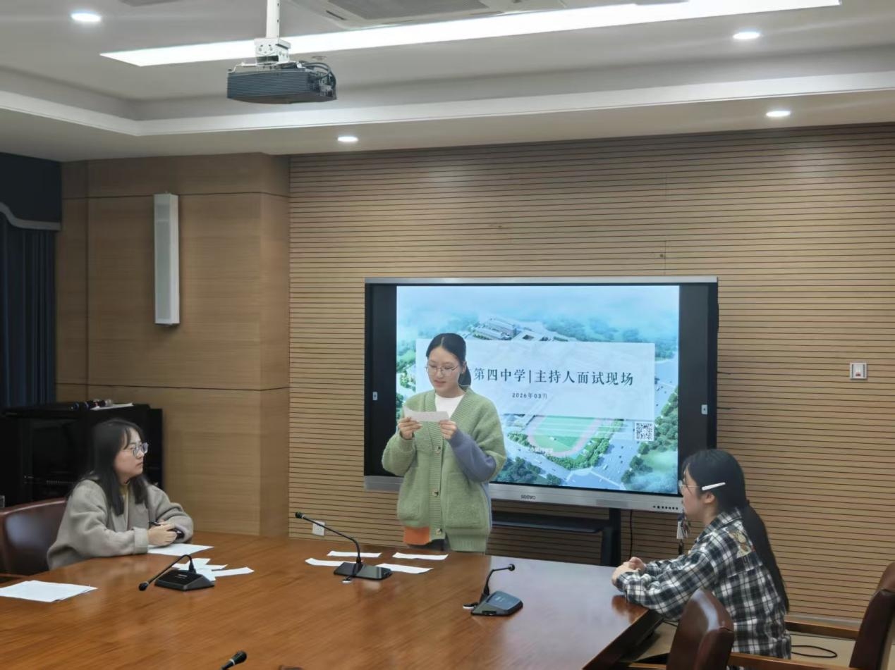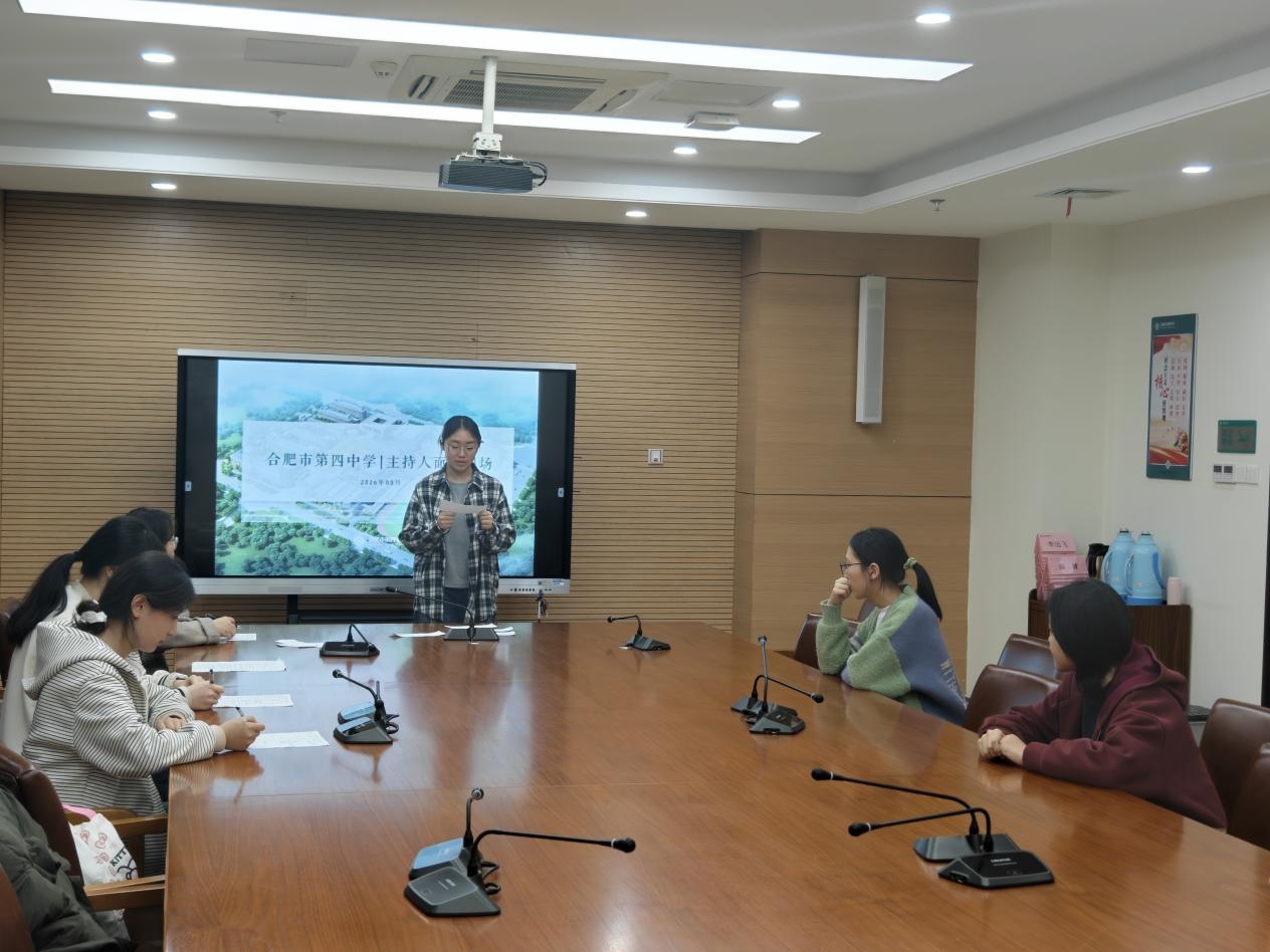 时值丙午新春,万象更新。为丰富校园文化生活,发掘与培养主持人才,彰显我校学子昂扬向上的精神风貌,2026年3月25日下午,合肥四中学生处在景贤书院四楼会议室举行2025级校级主持人选拔面试活动。活动现场井然有序,才俊云集,充分展现了四中学子的综合素养与青春风采。参与本次面试的有合肥四中学生处主任赵傲雪,学生处干事牛敬超以及往届主持人代表钟清嘉、刘嘉欣等。