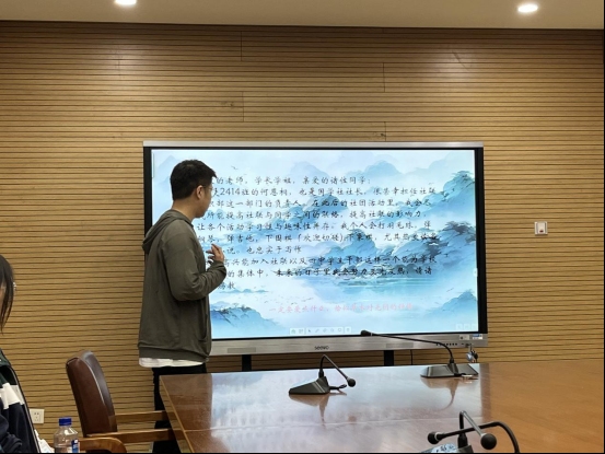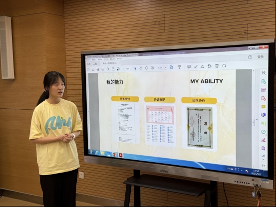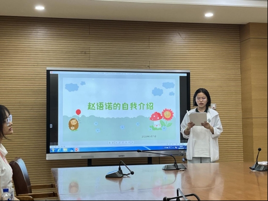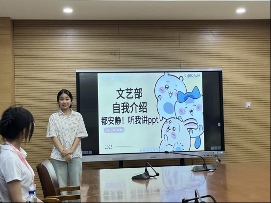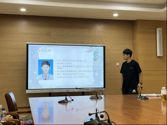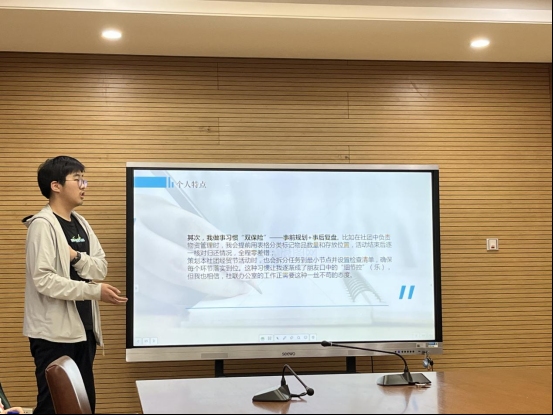 大会伊始,团委刘慧老师向与会人员介绍了出席的领导与老师。接着,23级学生干部依次进行自我介绍,体现了他们谦逊有礼的品质,也体现了学生会和社团联合会的延续。各部门代表也分别阐述了岗位职责。赓续时代薪火,共谱校园华章。24级学生干部接过接力棒,挑起校园文明建设重担,体现勇气和担当。“恰同学少年,风华正茂”,学生干部们生机勃勃,充满朝气。24级学生干部紧随其后,依次做起了自我介绍。介绍内容丰富多彩,同学们还精心准备了PPT,足以体现对本次活动的重视。介绍内容主要以自己的性格特点,在校举办活动的经历,参加工作的优势和对未来工作的展望规划。