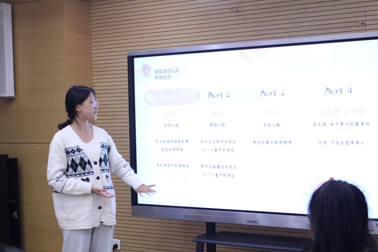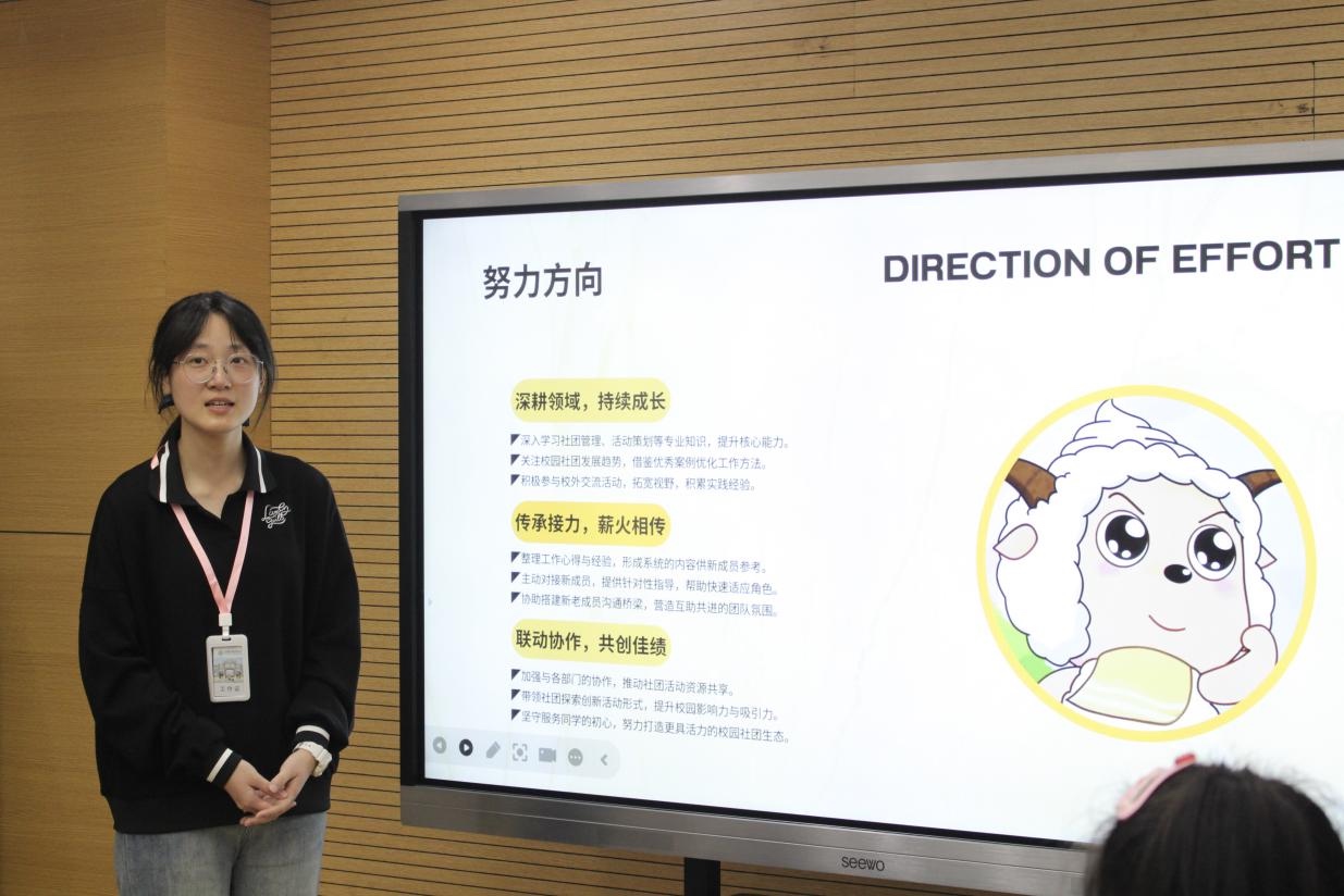 会议第三项,“新老接力”结对人员自我介绍。由24级的优秀学生干部和25级的学生干部依次登台进行自我介绍,通过生动有创意的PPT,结合丰富的经历事迹介绍,让大家对彼此有了初步的认识,也展现了大家服务同学的坚定决心和朝气蓬勃的积极面貌。